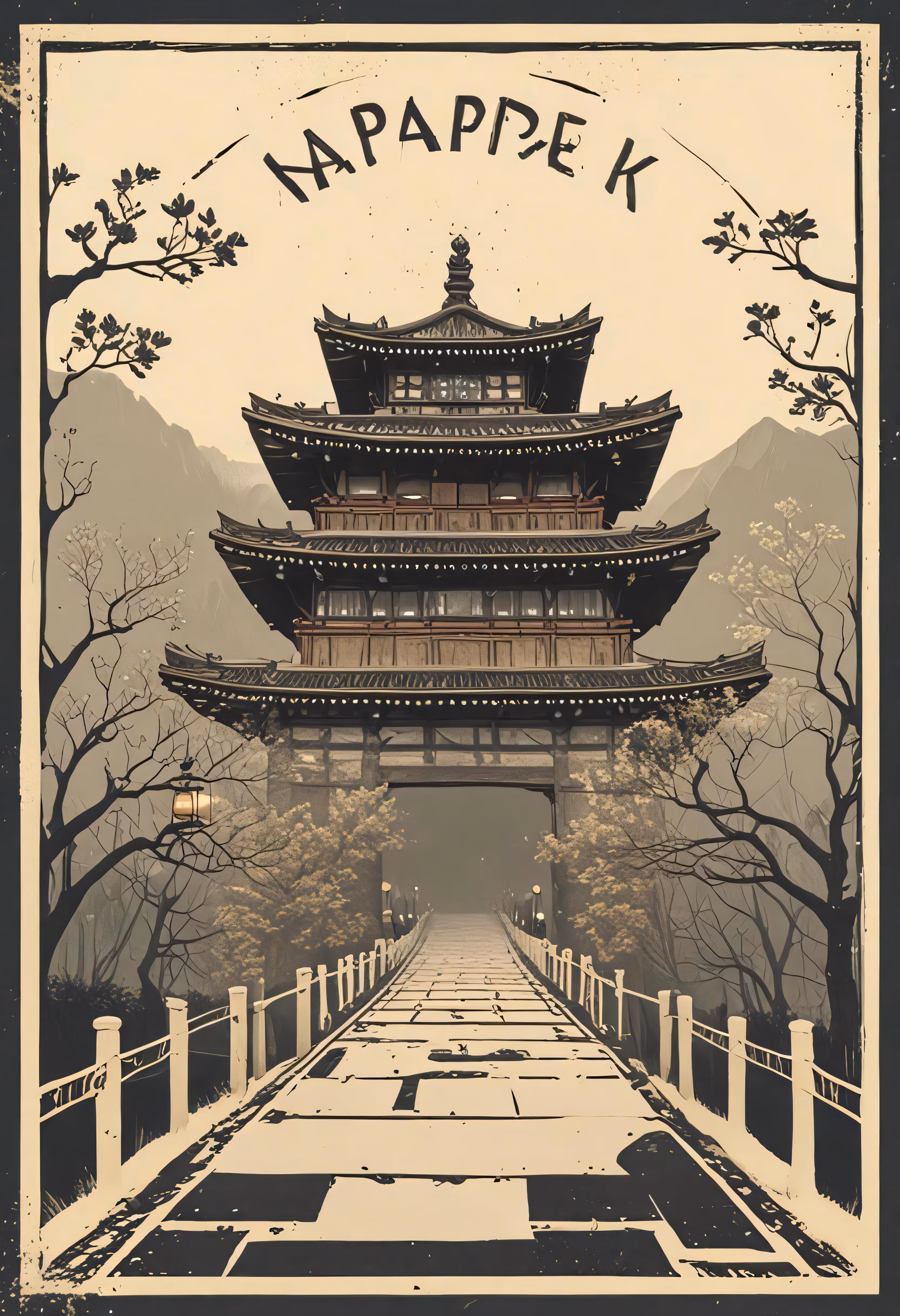 High resolution picture, free to use, a chinese   styled travel poster that features a pagoda in the woods
