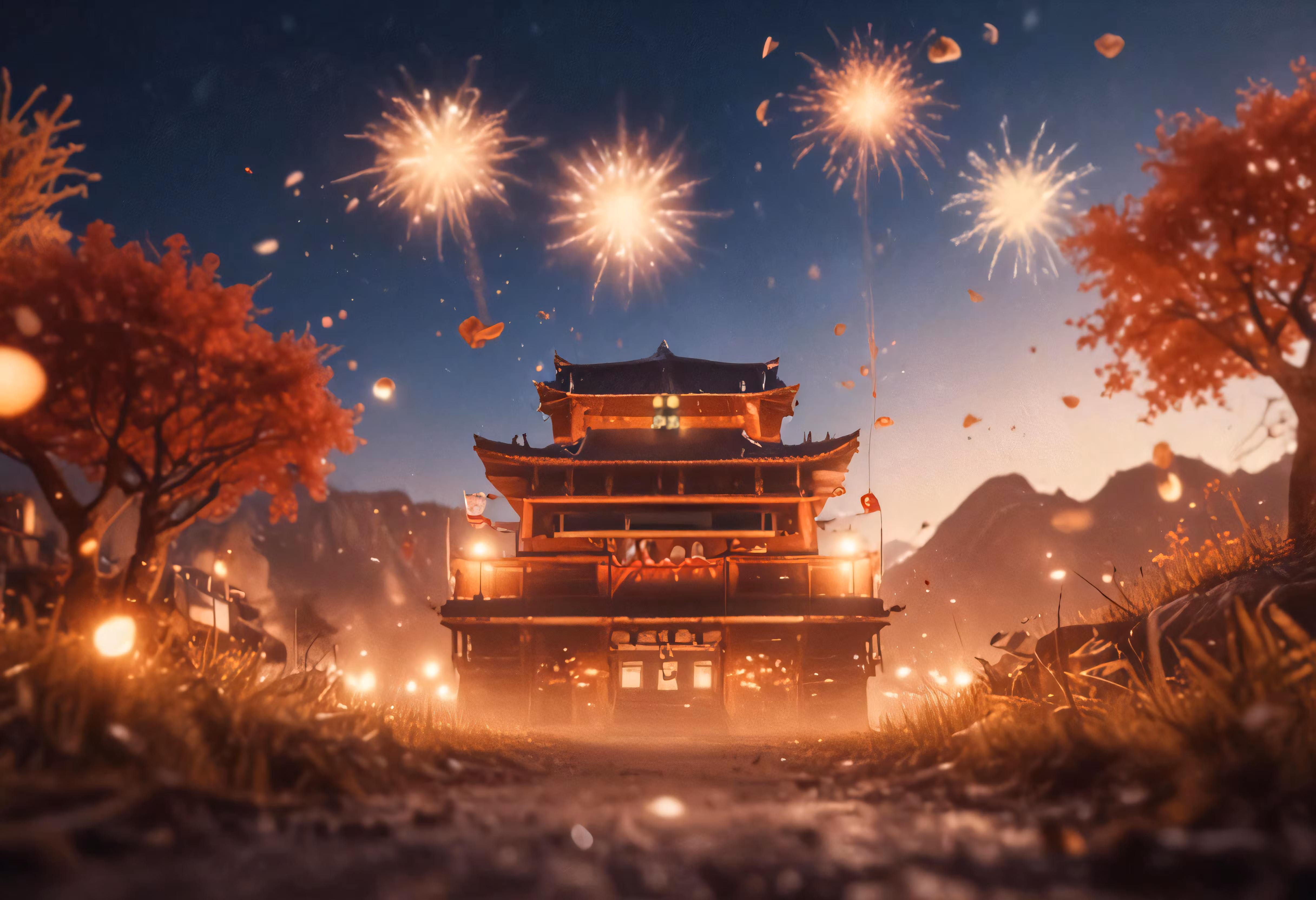 High resolution picture, free to use, a chinese building in the middle of a forest at night