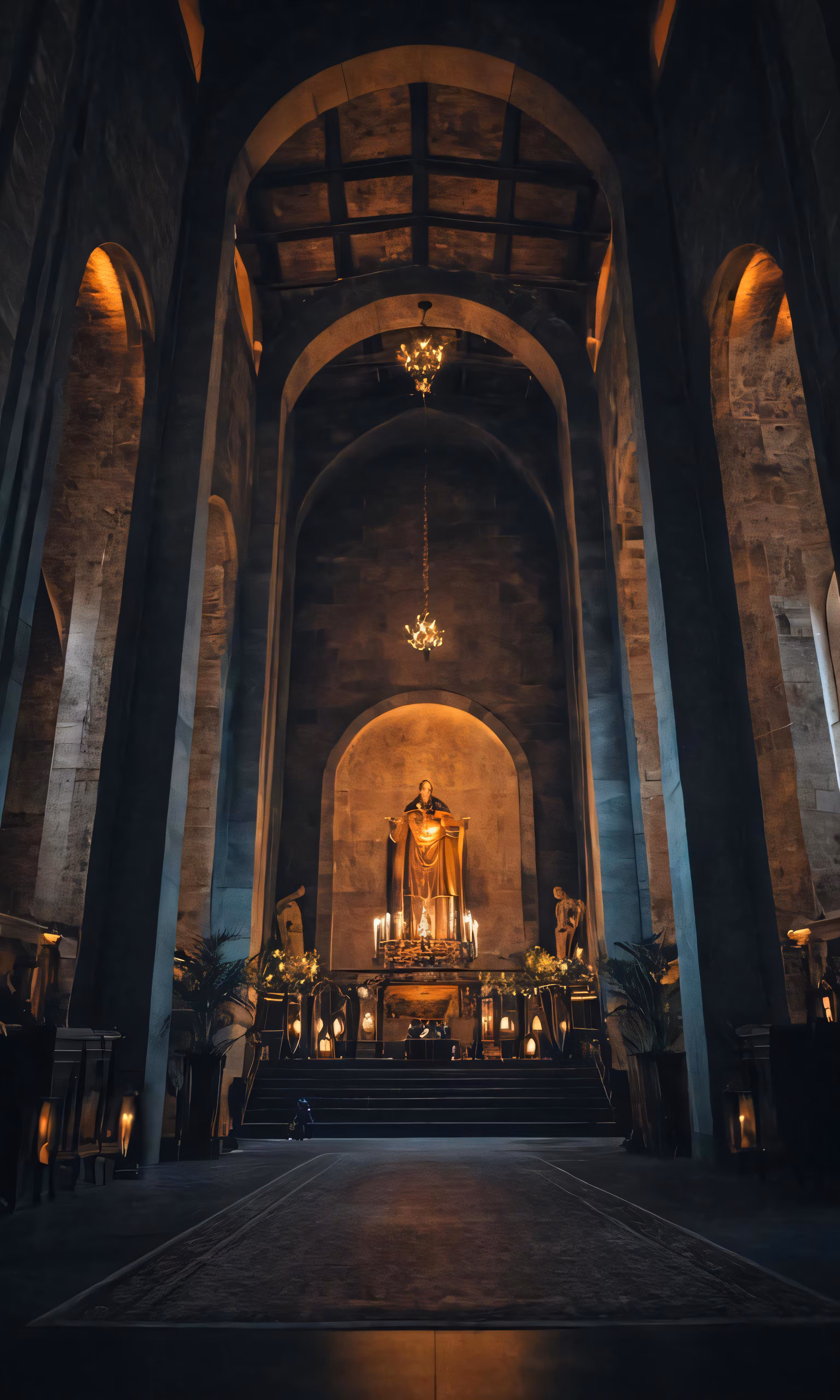High resolution picture, free to use, a church with an elegantly decorated altar and chandelier
