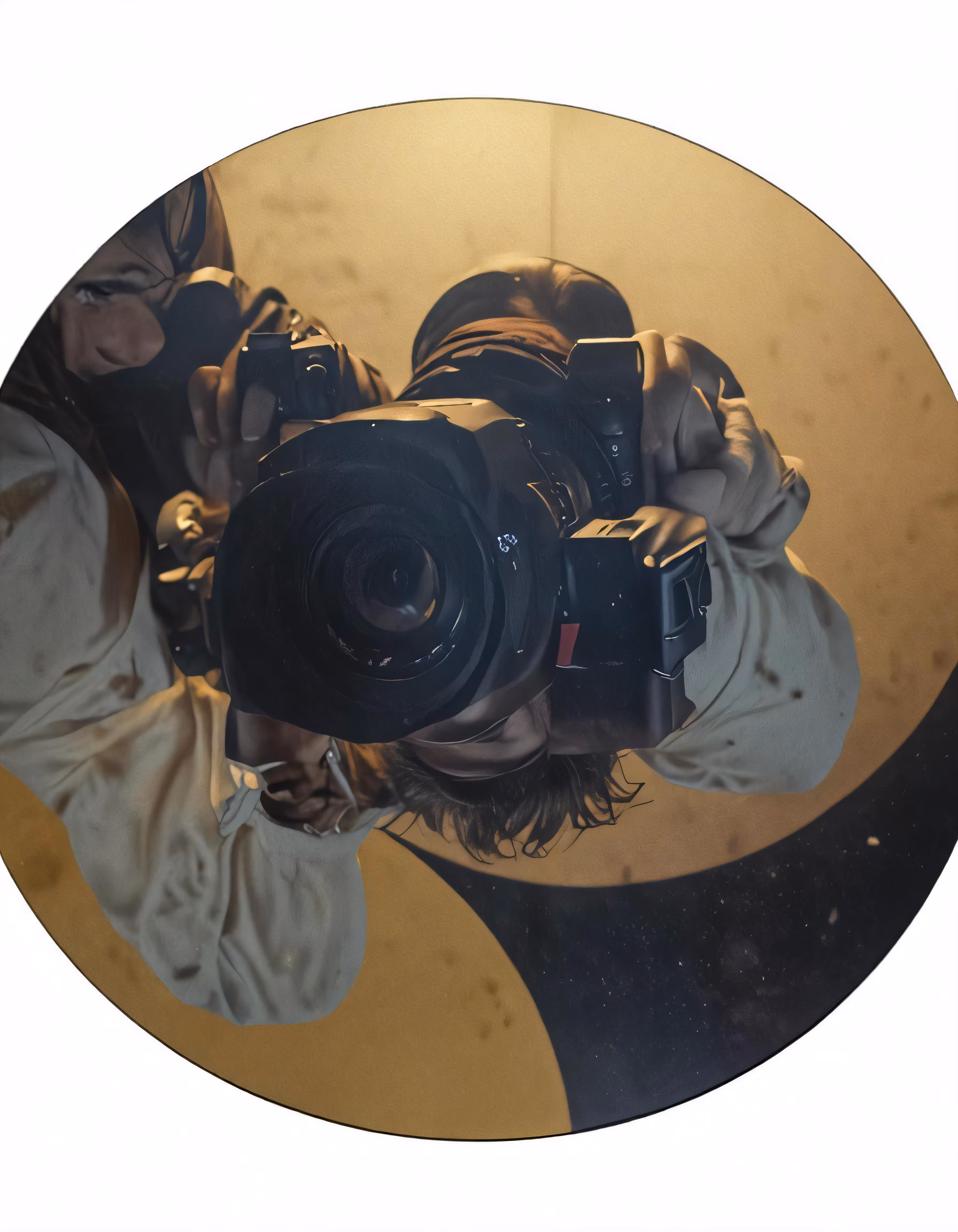 High resolution picture, free to use, a circular mirror shows a person taking a photograph with their camera