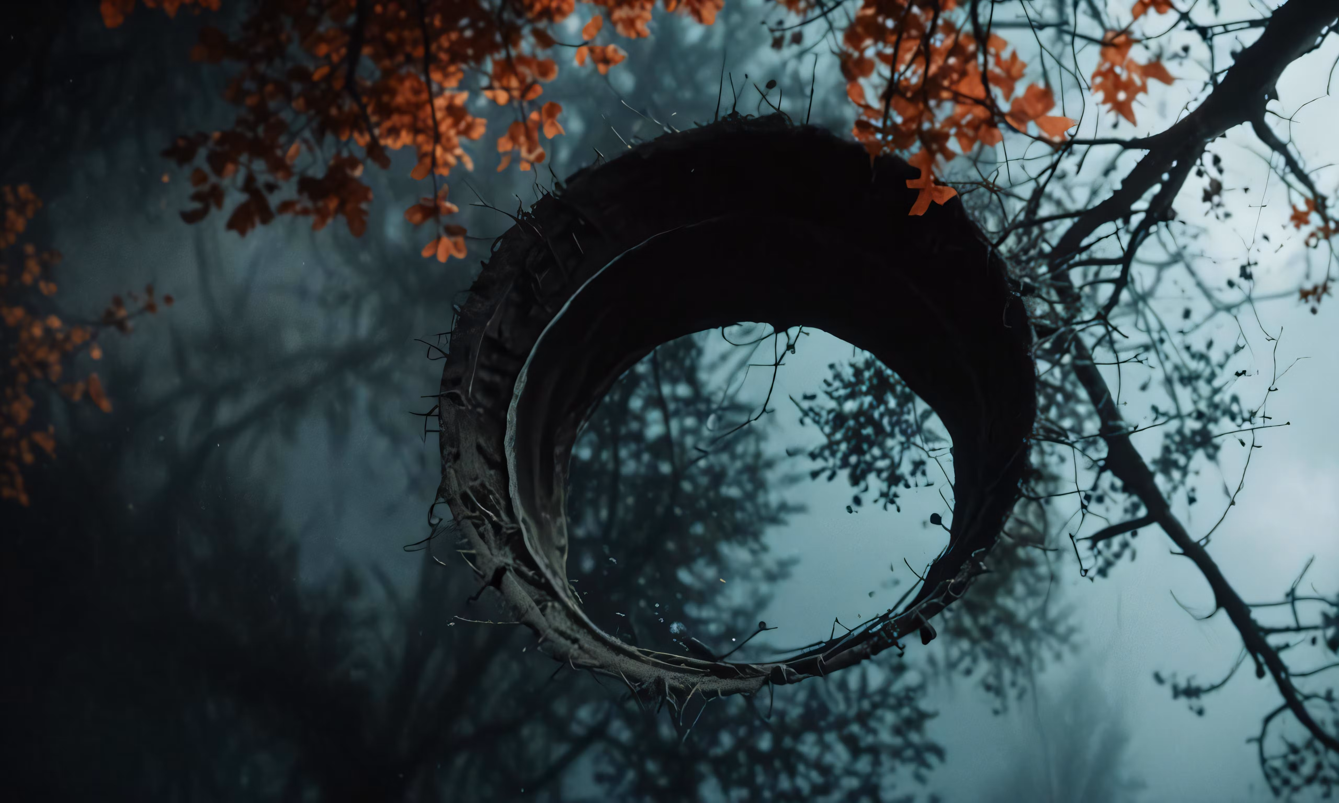 High resolution picture, free to use, a circular object suspended from the tree in front of some leaves