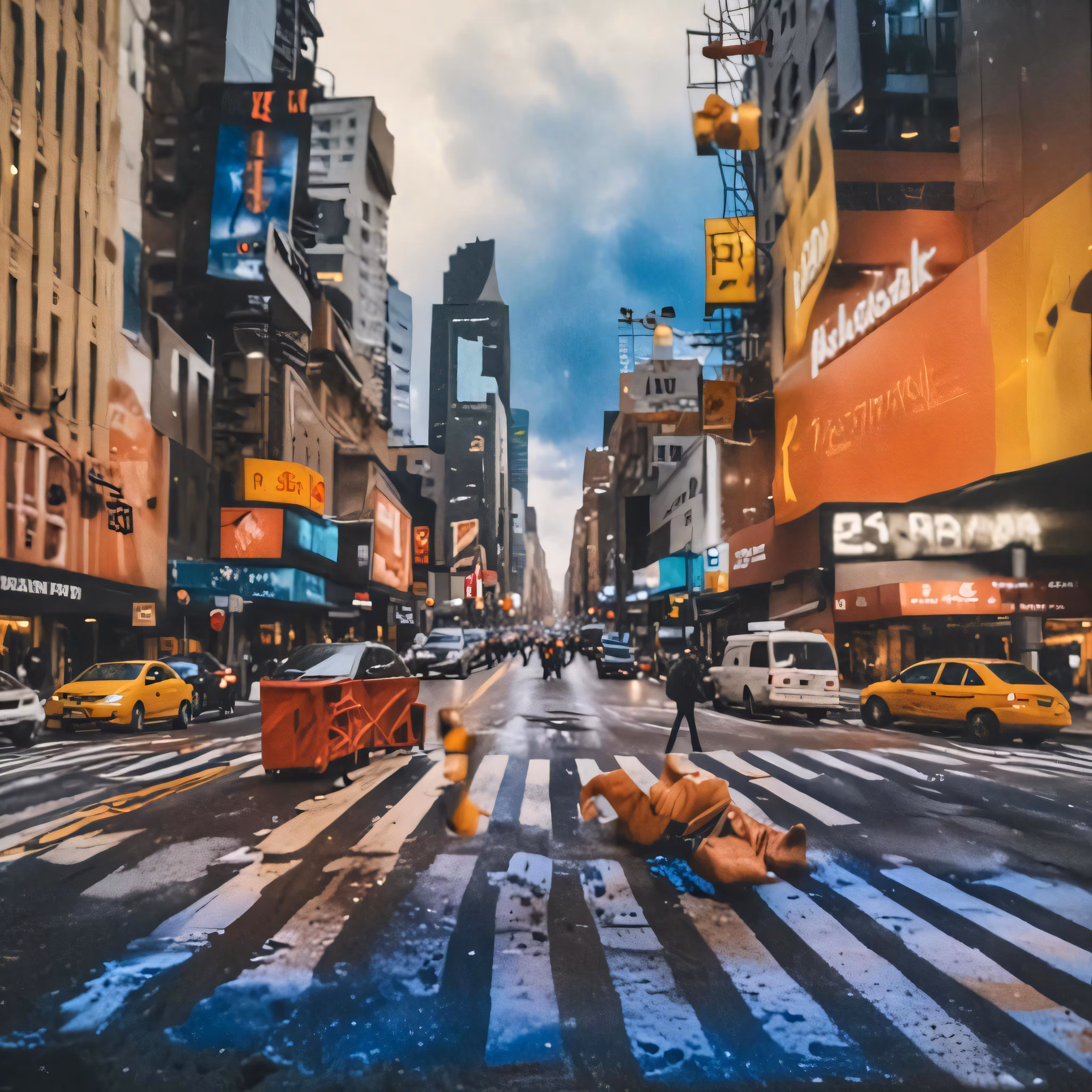 High resolution picture, free to use, a city scene with pedestrians and buildings on a rainy day