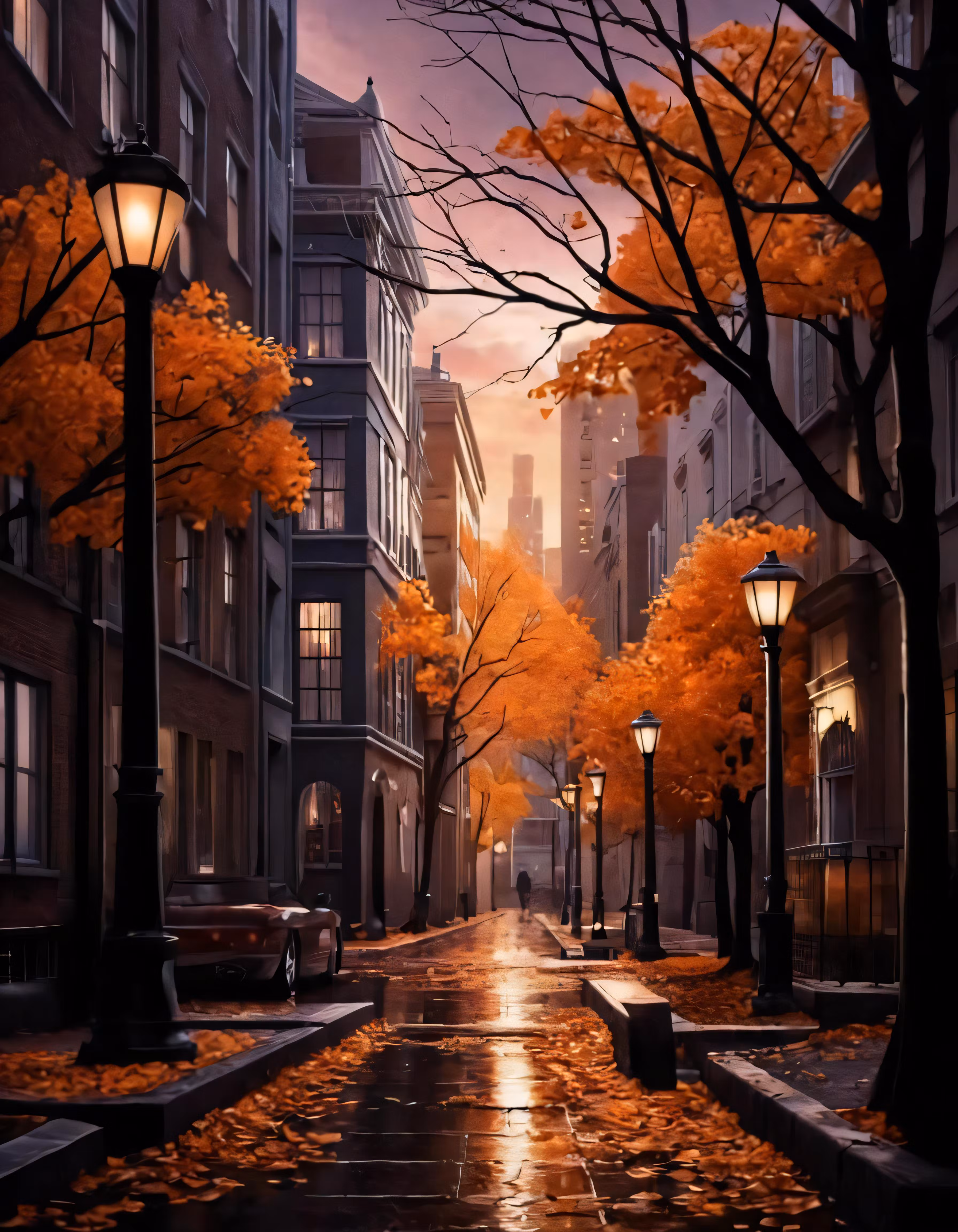 High resolution picture, free to use, a city street in the fall with lots of leaves