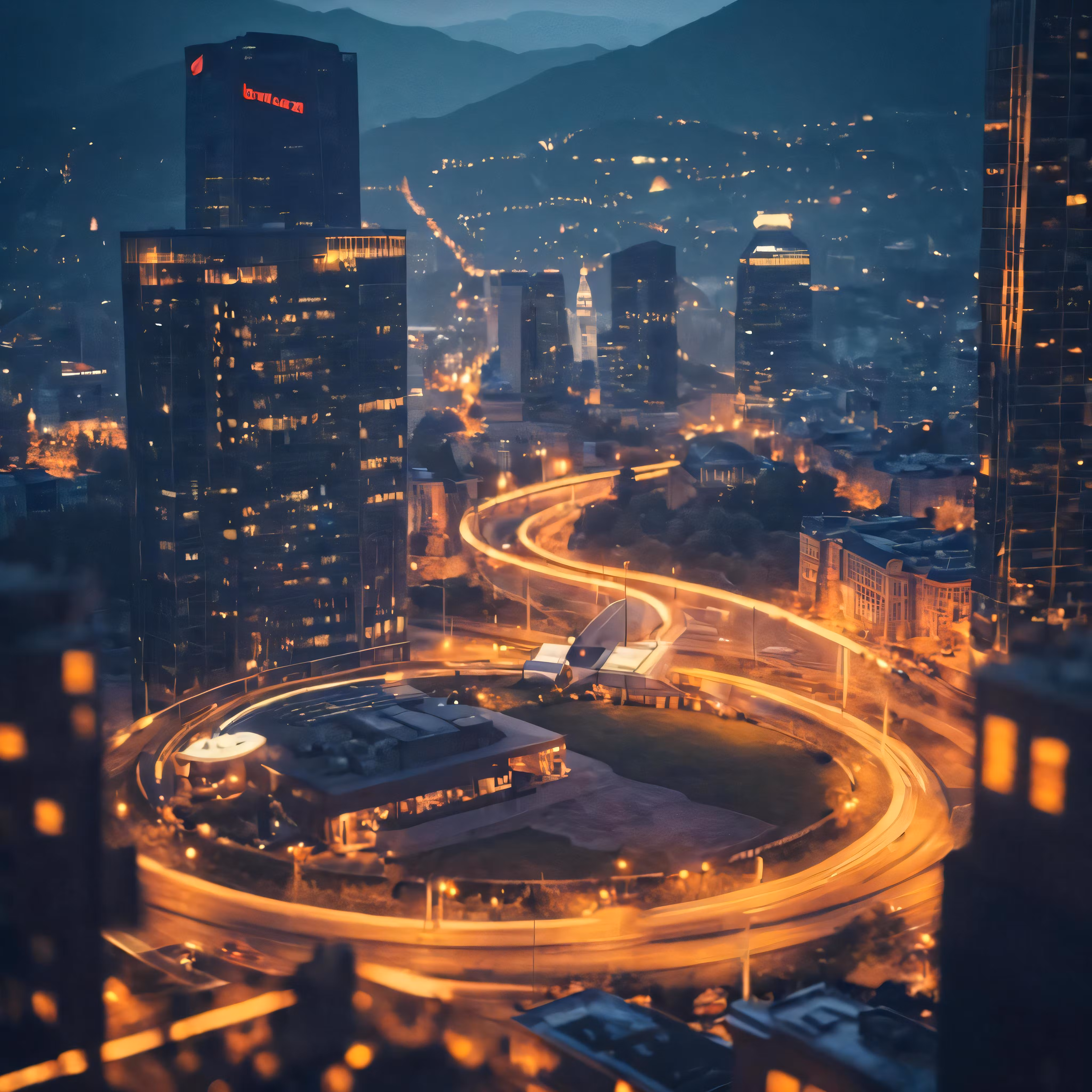 High resolution picture, free to use, a cityscape at night with a ringed road in the center