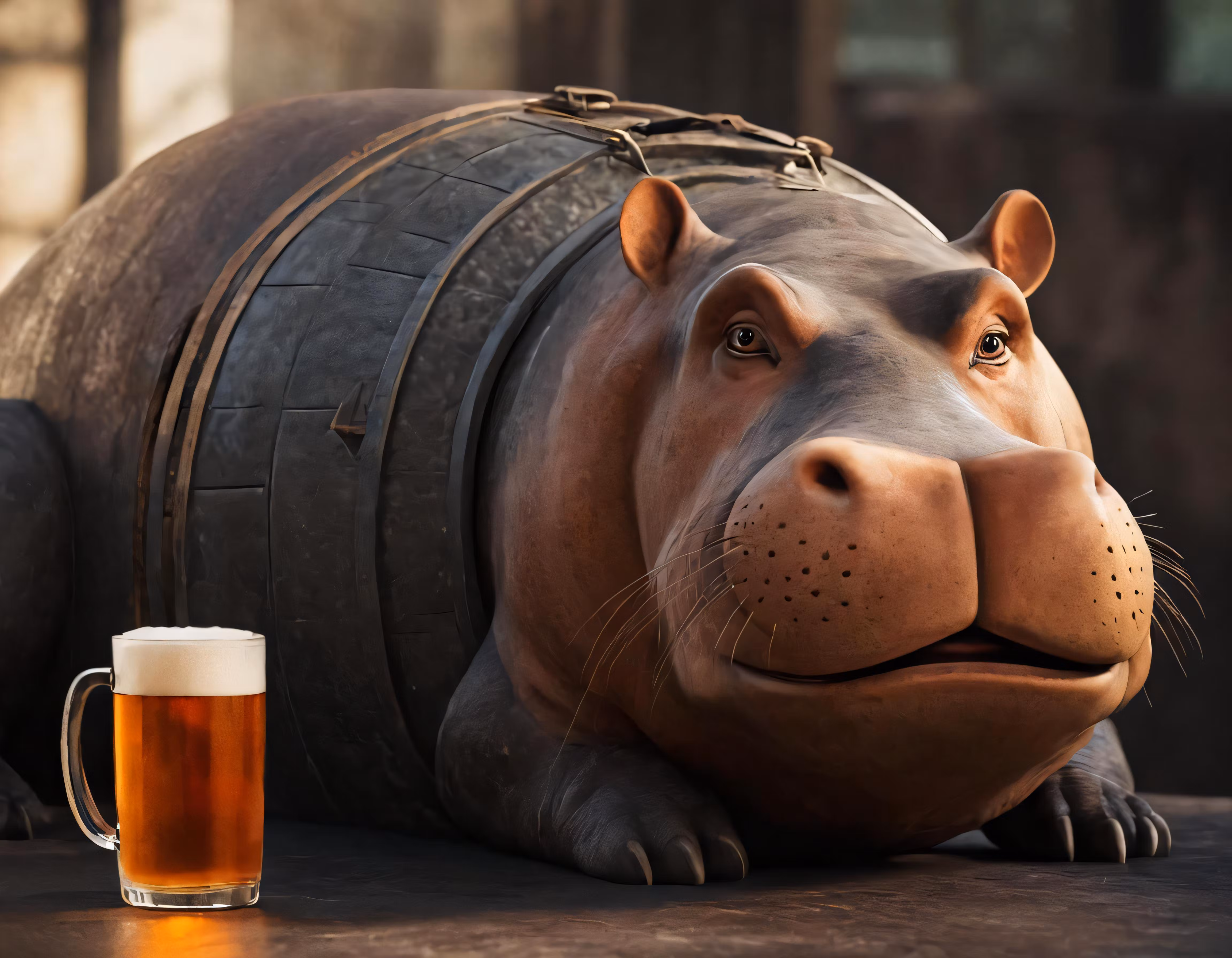 High resolution picture, free to use, a close up of a hippopotamus next to a beer glass