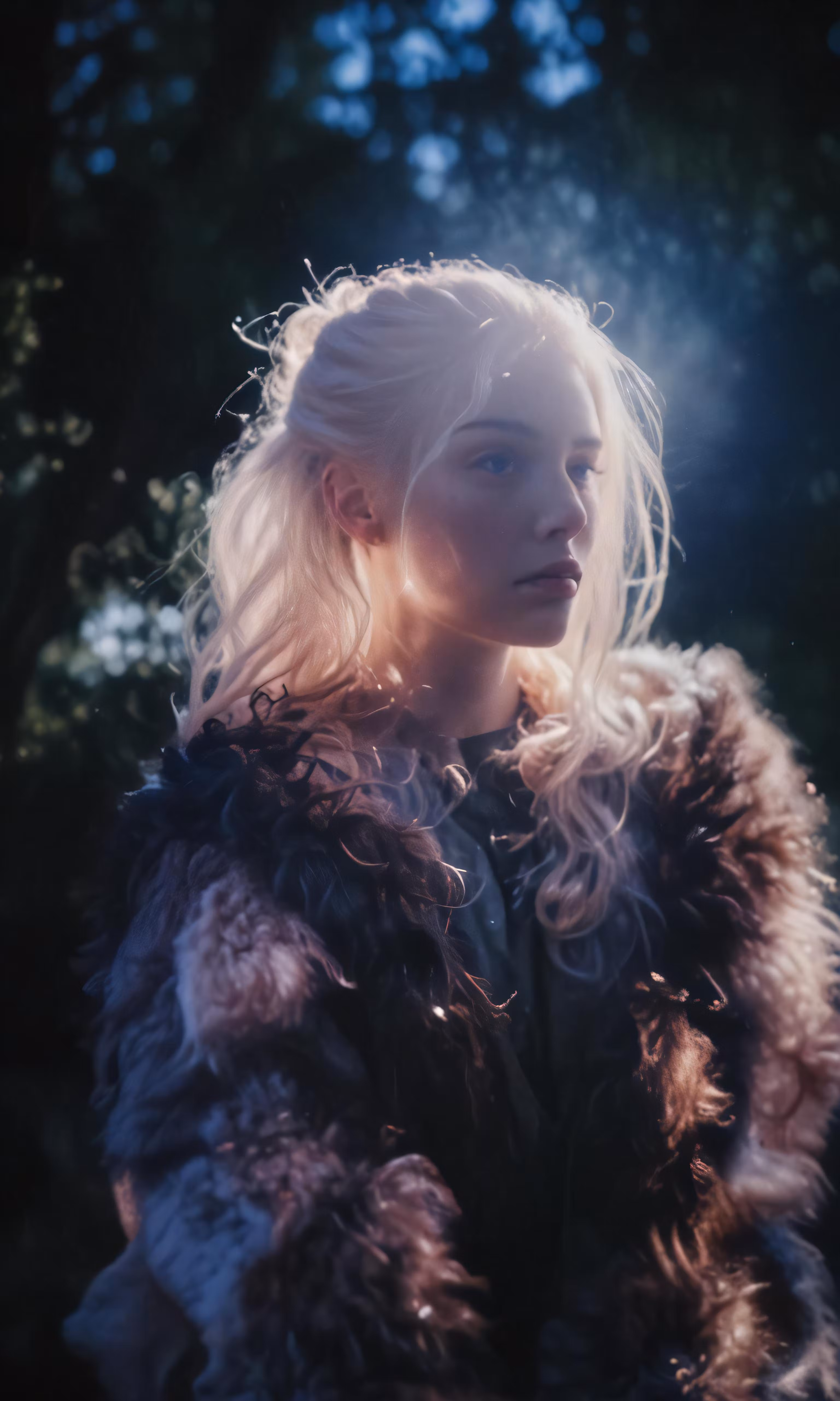 High resolution picture, free to use, a close up of a person wearing fur and a sun shining