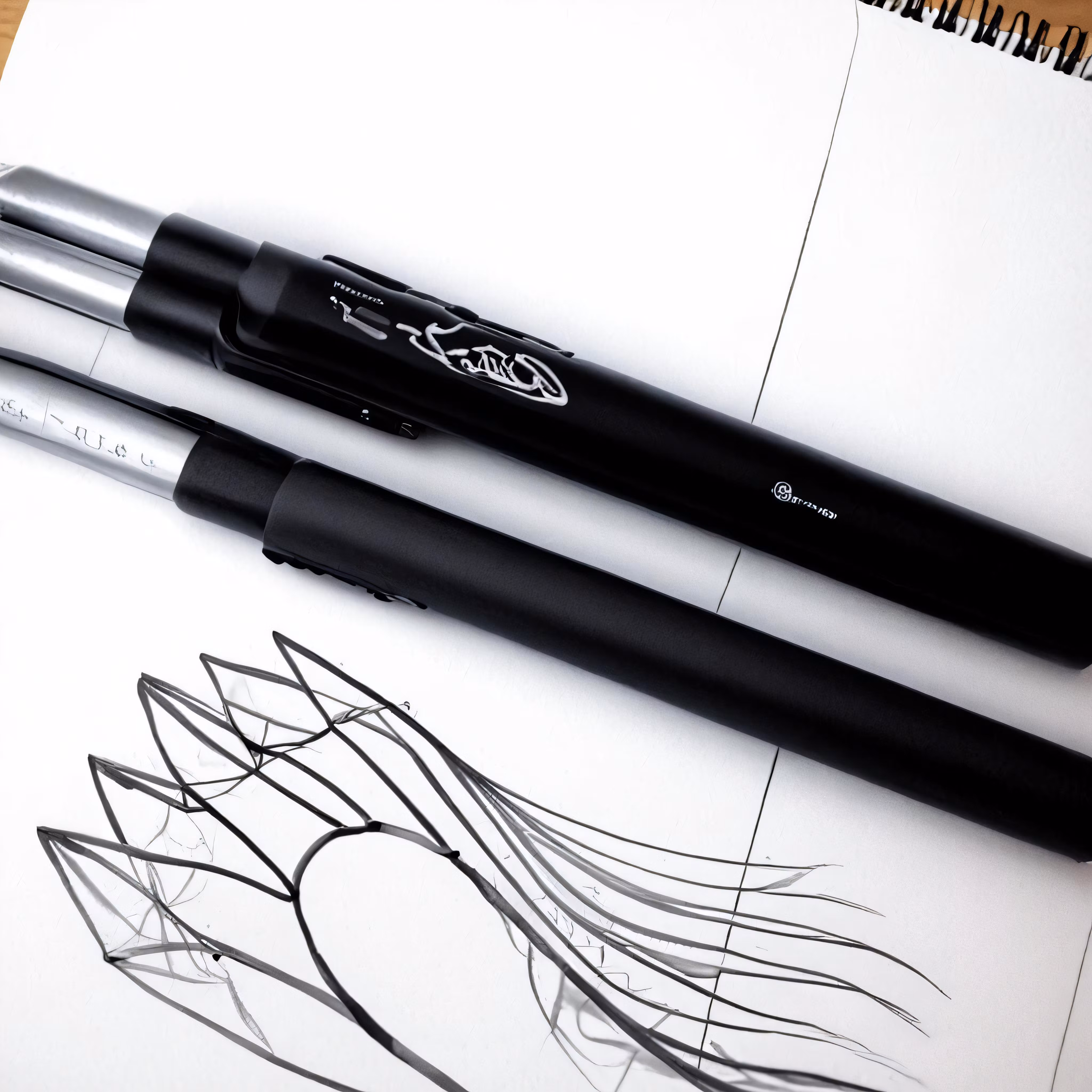 High resolution picture, free to use, a closeup of some sketches and pens