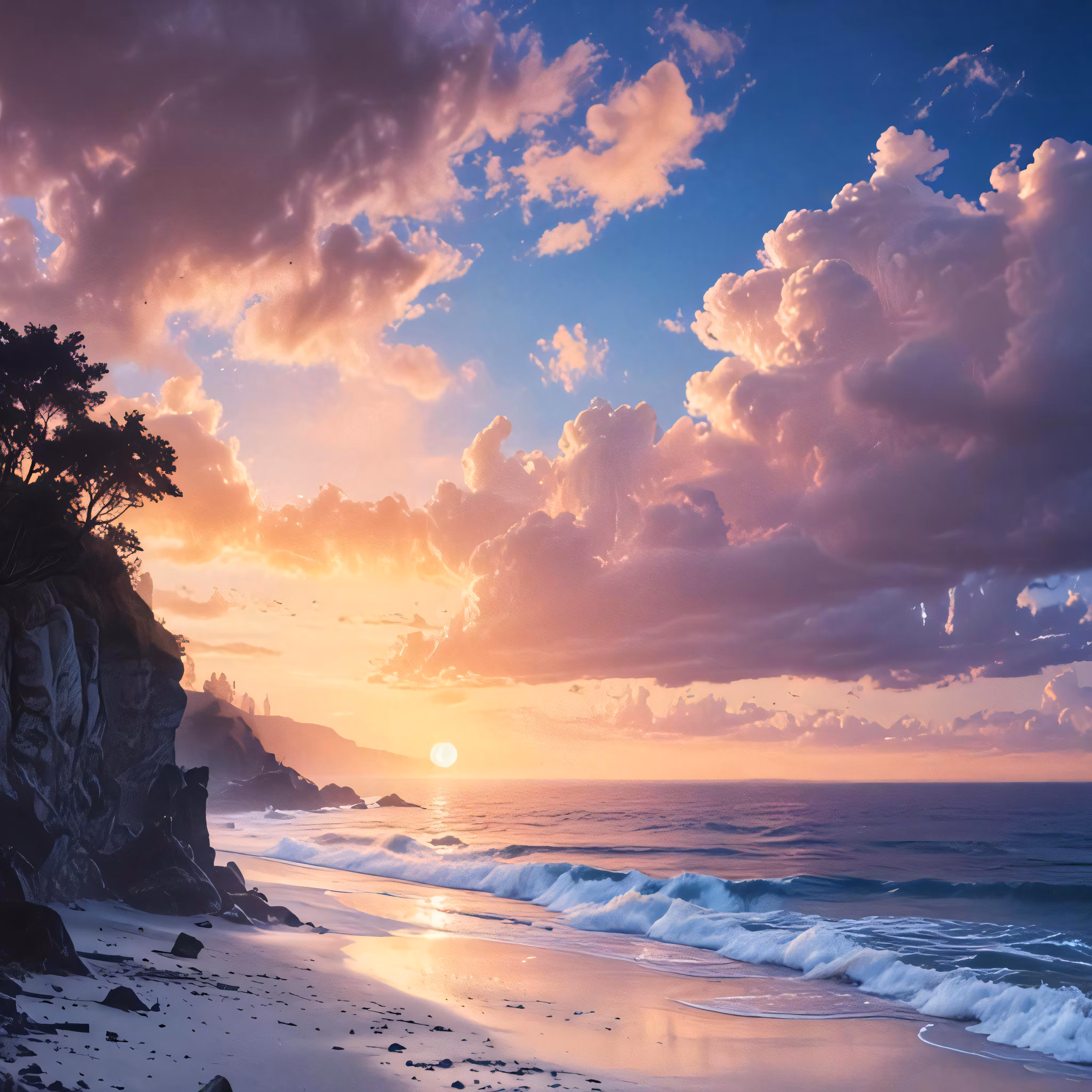 High resolution picture, free to use, a cloudy sky and sunset on the beach near some water