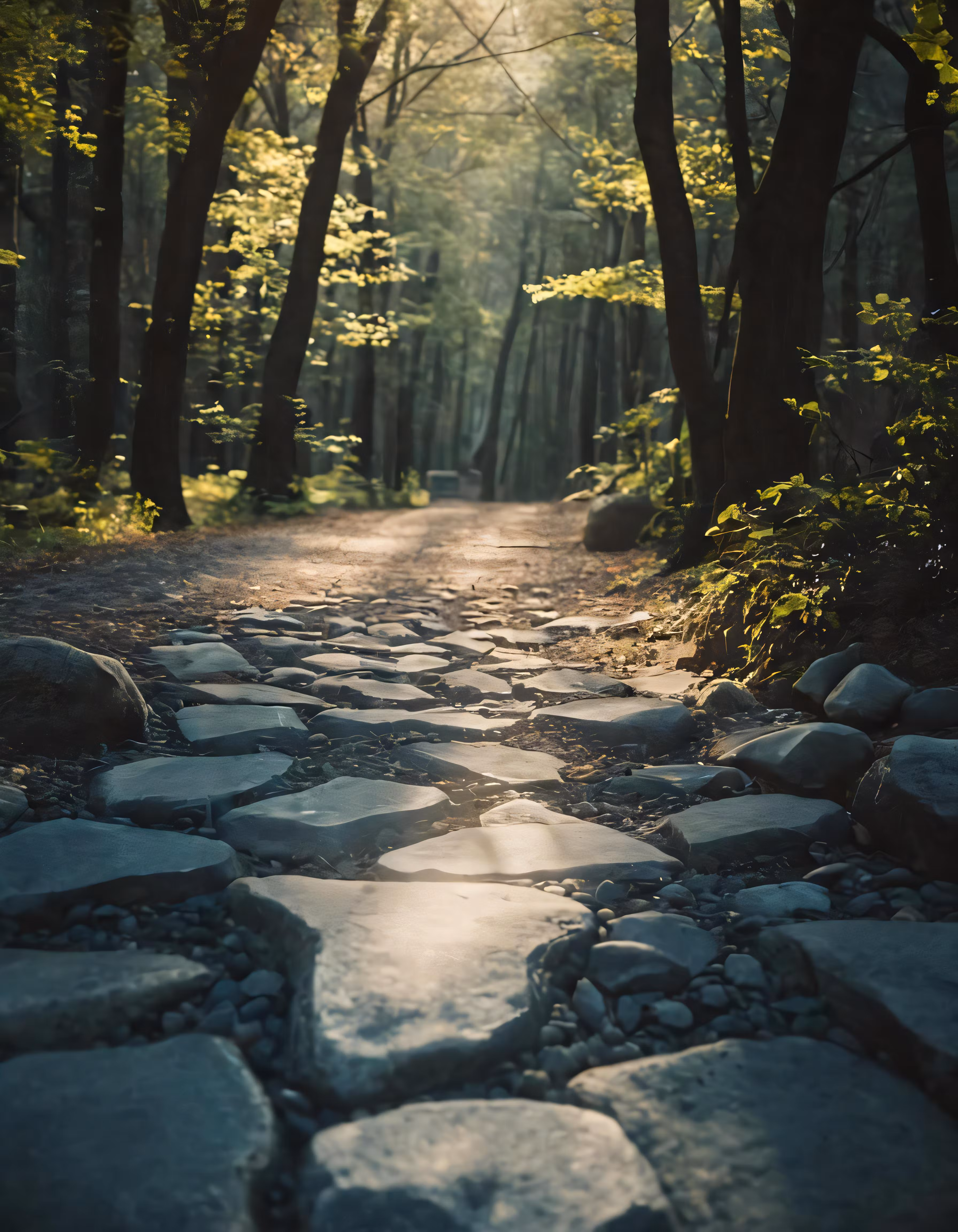 High resolution picture, free to use, a cobblestone stone road running through the middle of a forest