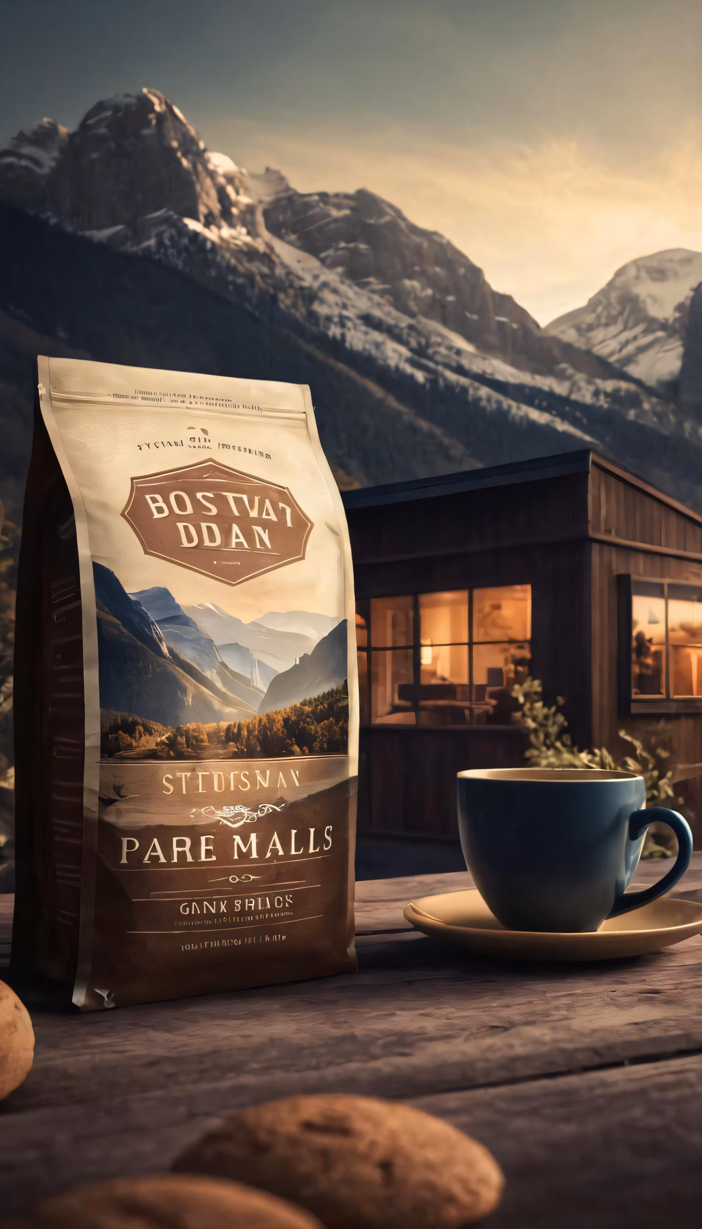 High resolution picture, free to use, a coffee bag, cup and a plate next to a mountain