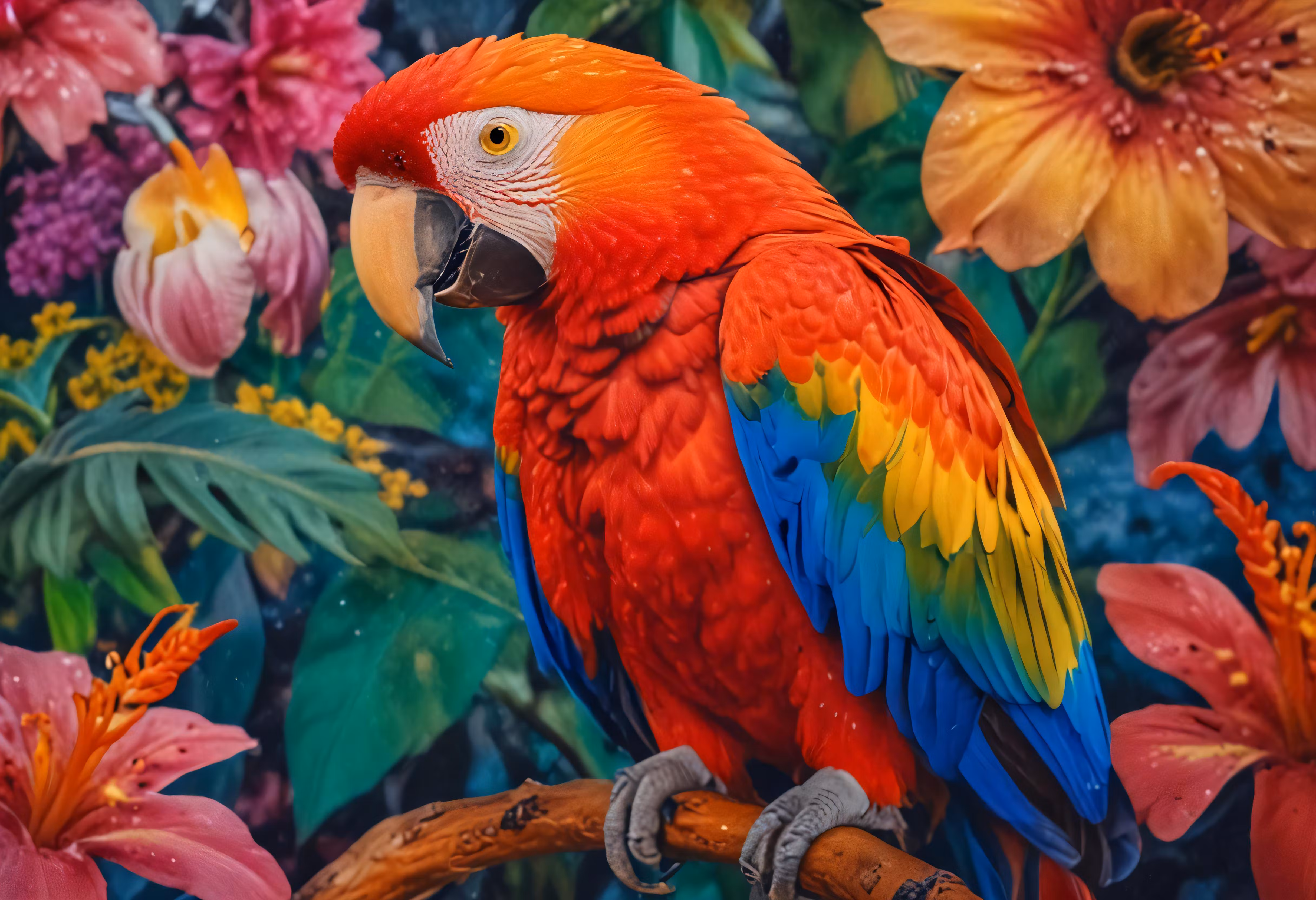 High resolution picture, free to use, a colorful bird sitting on a branch near flowers