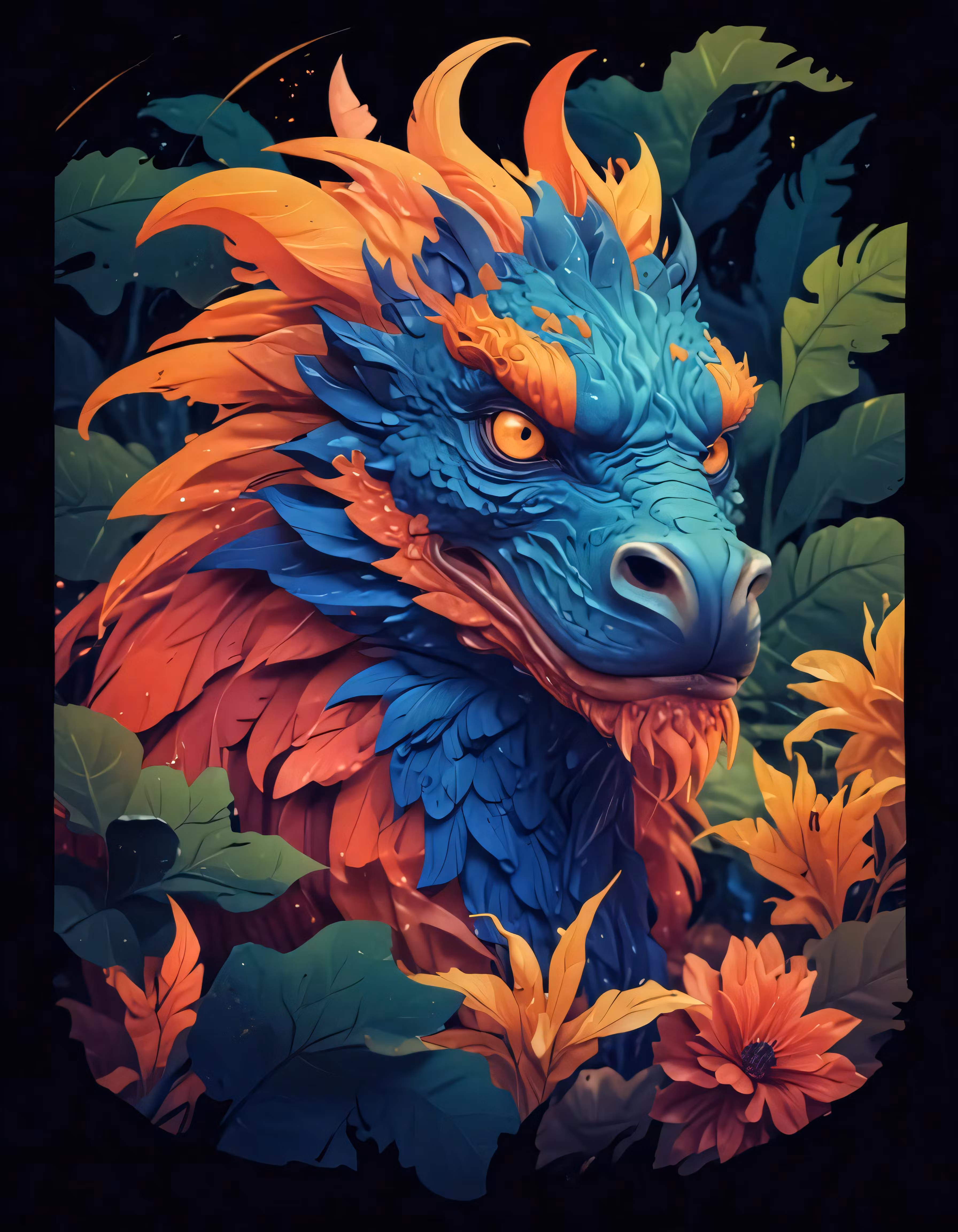 High resolution picture, free to use, a colorful blue dragon with orange mane and gold eyes
