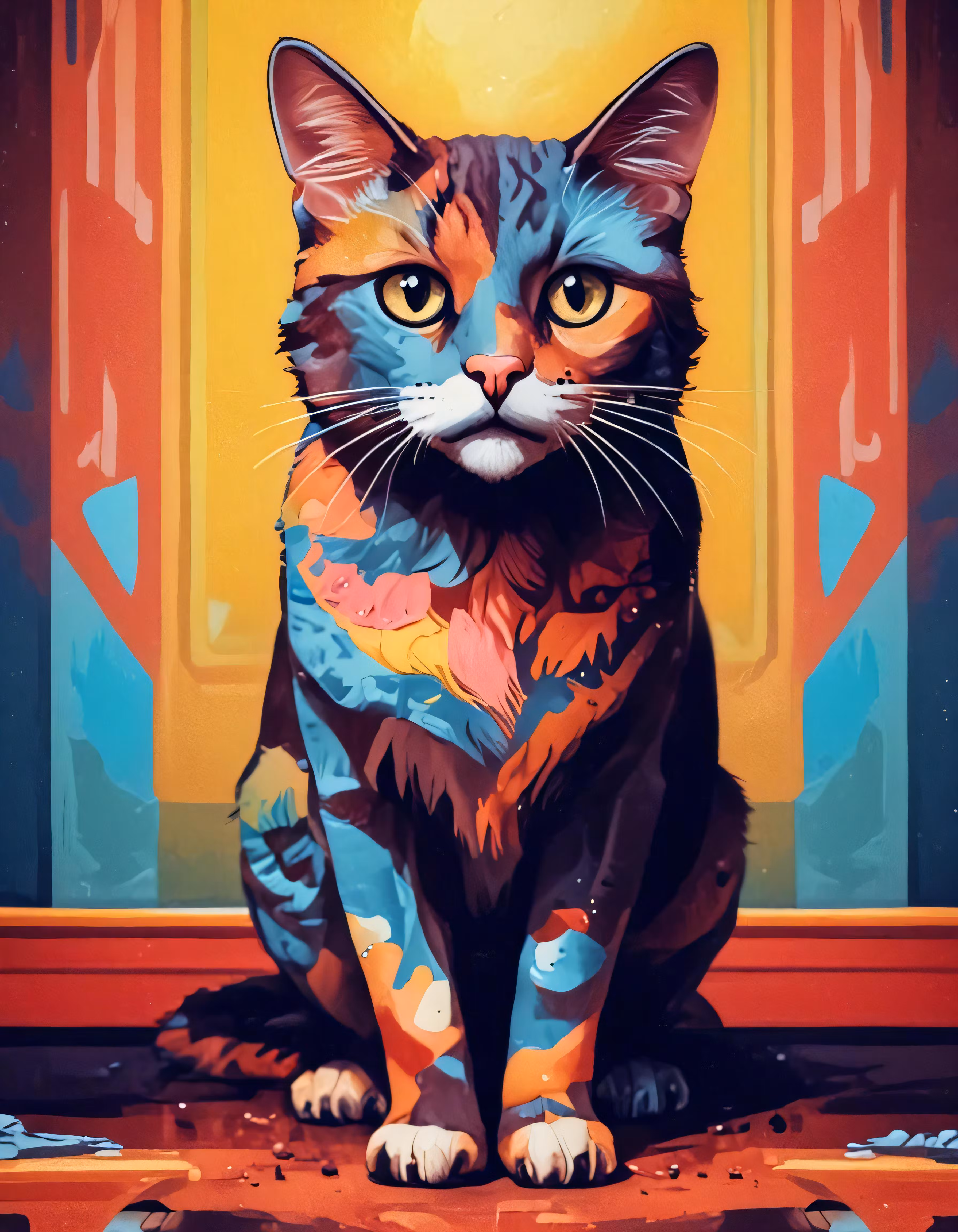 High resolution picture, free to use, a colorful cat sits on the ground
