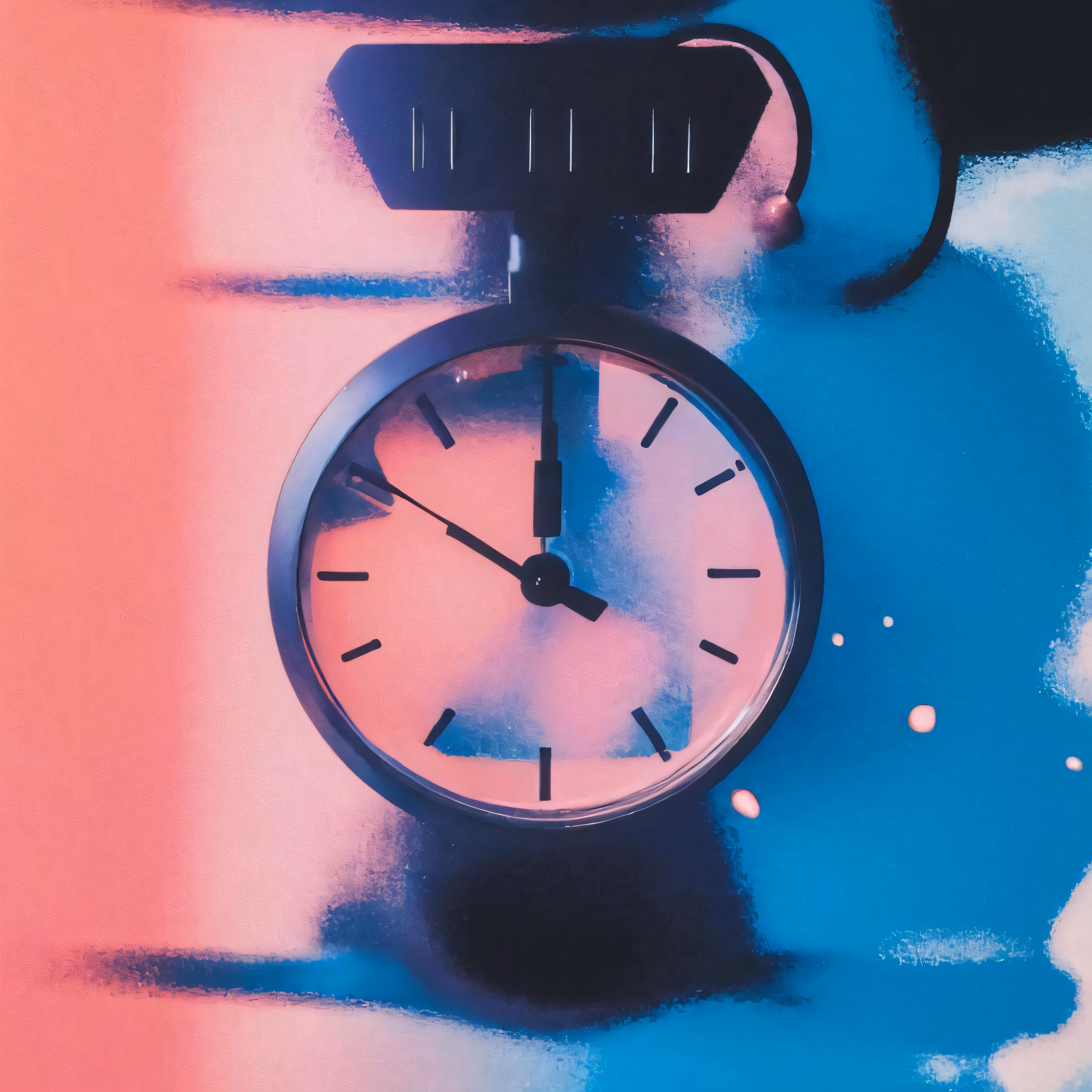 High resolution picture, free to use, a colorful clock hangs against a pink, blue and turquoise background