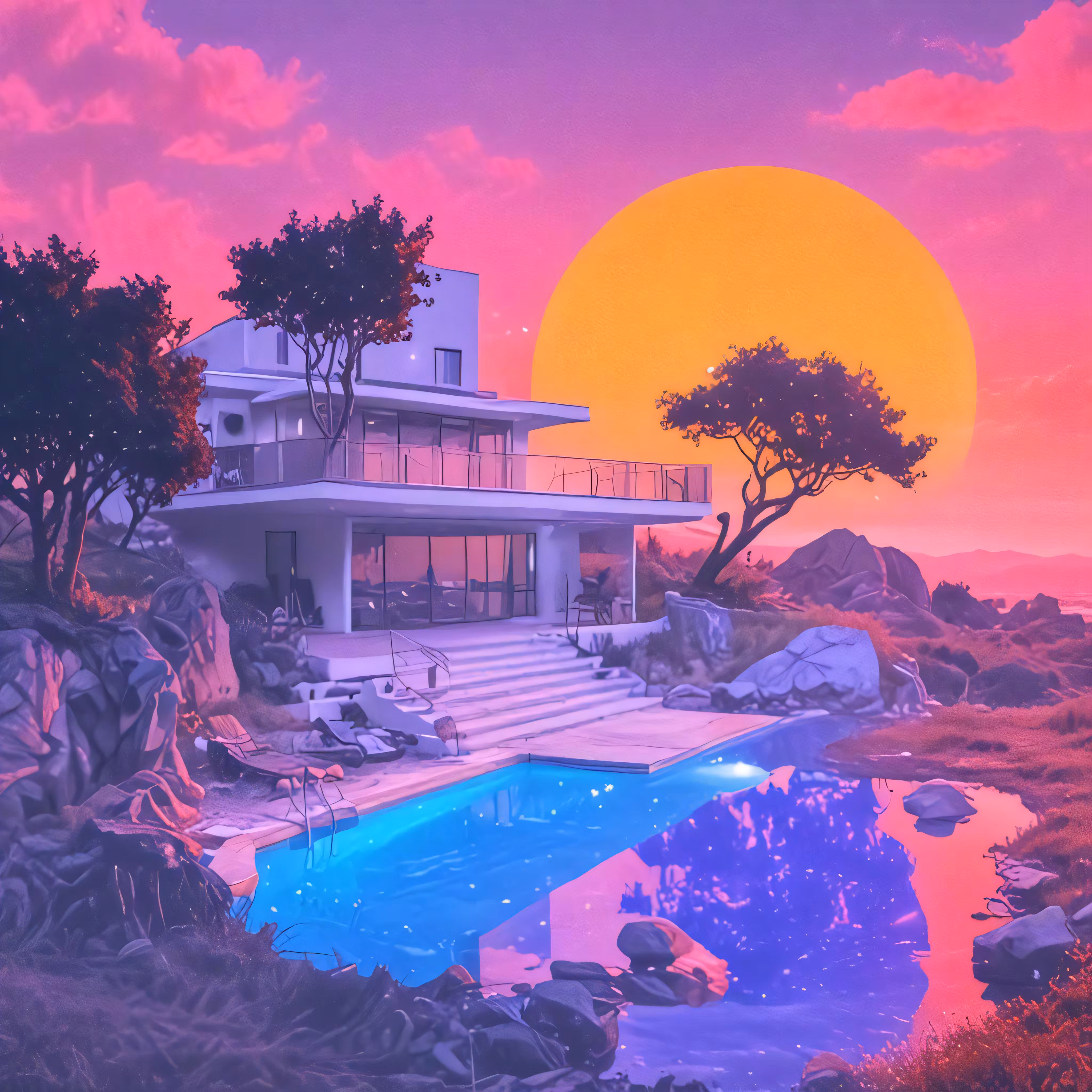 High resolution picture, free to use, a colorful image of a house with the sun rising over it