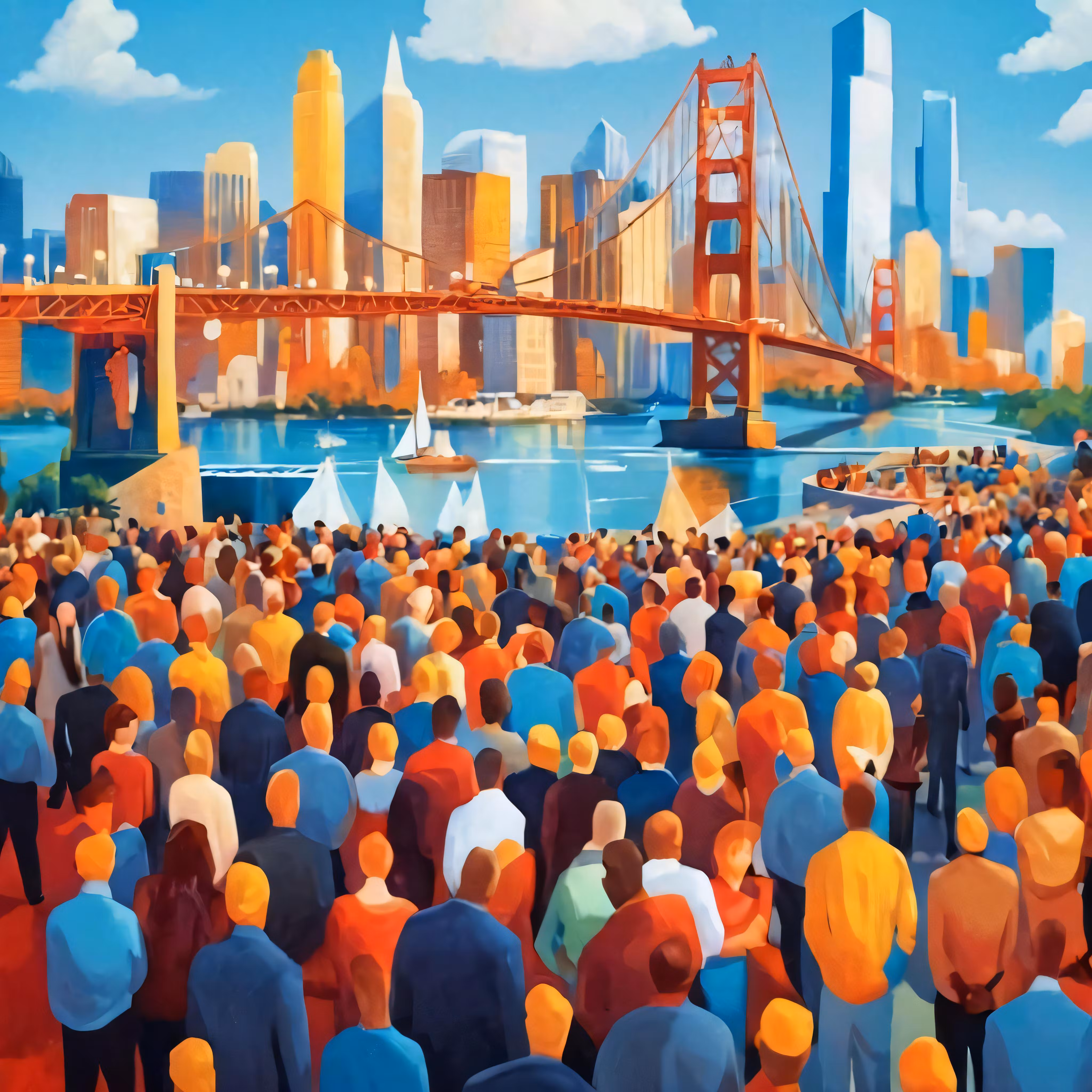 High resolution picture, free to use, a colorful painting of an urban skyline with people
