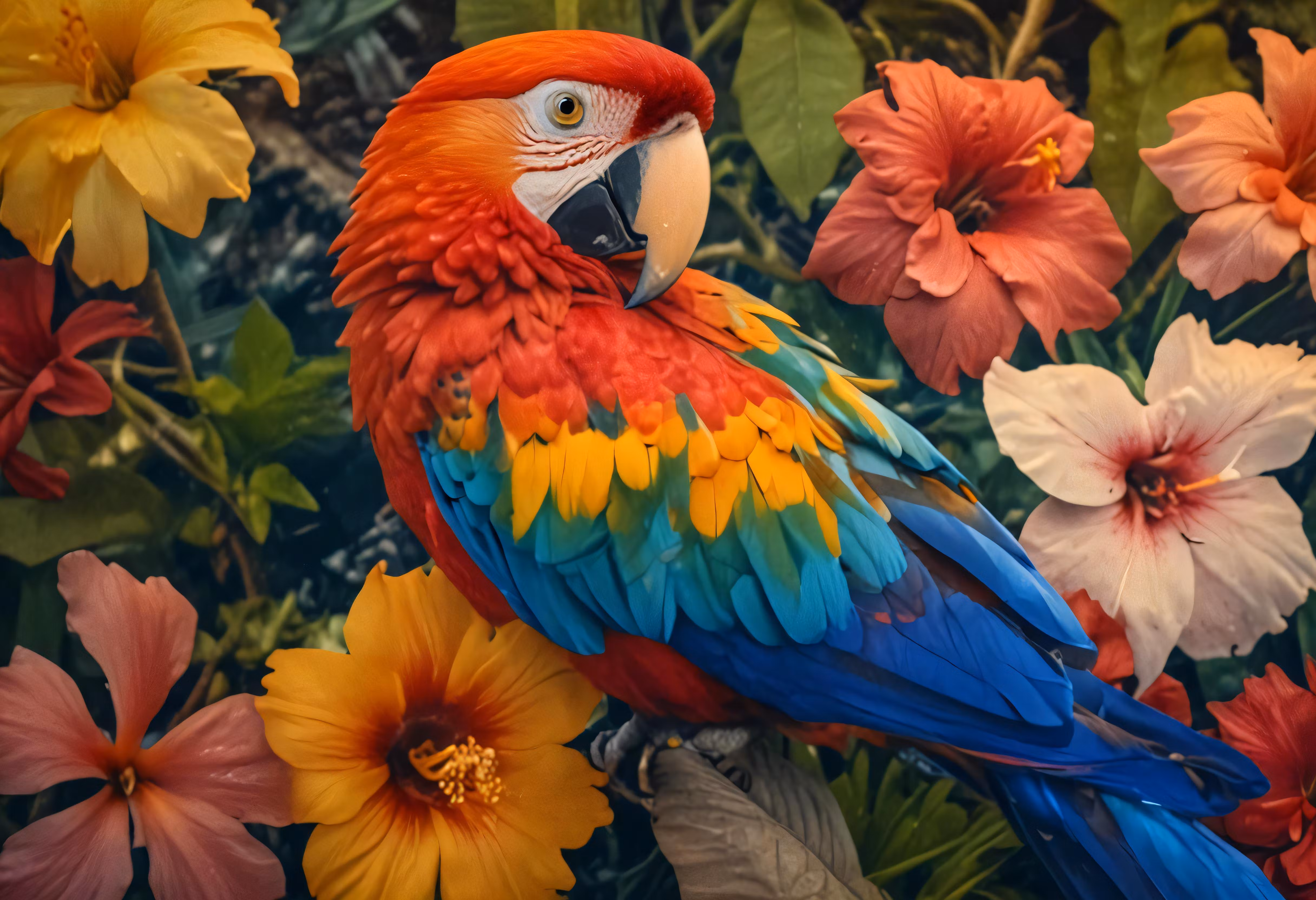 High resolution picture, free to use, a colorful parrot perched on a tree surrounded by colorful flowers