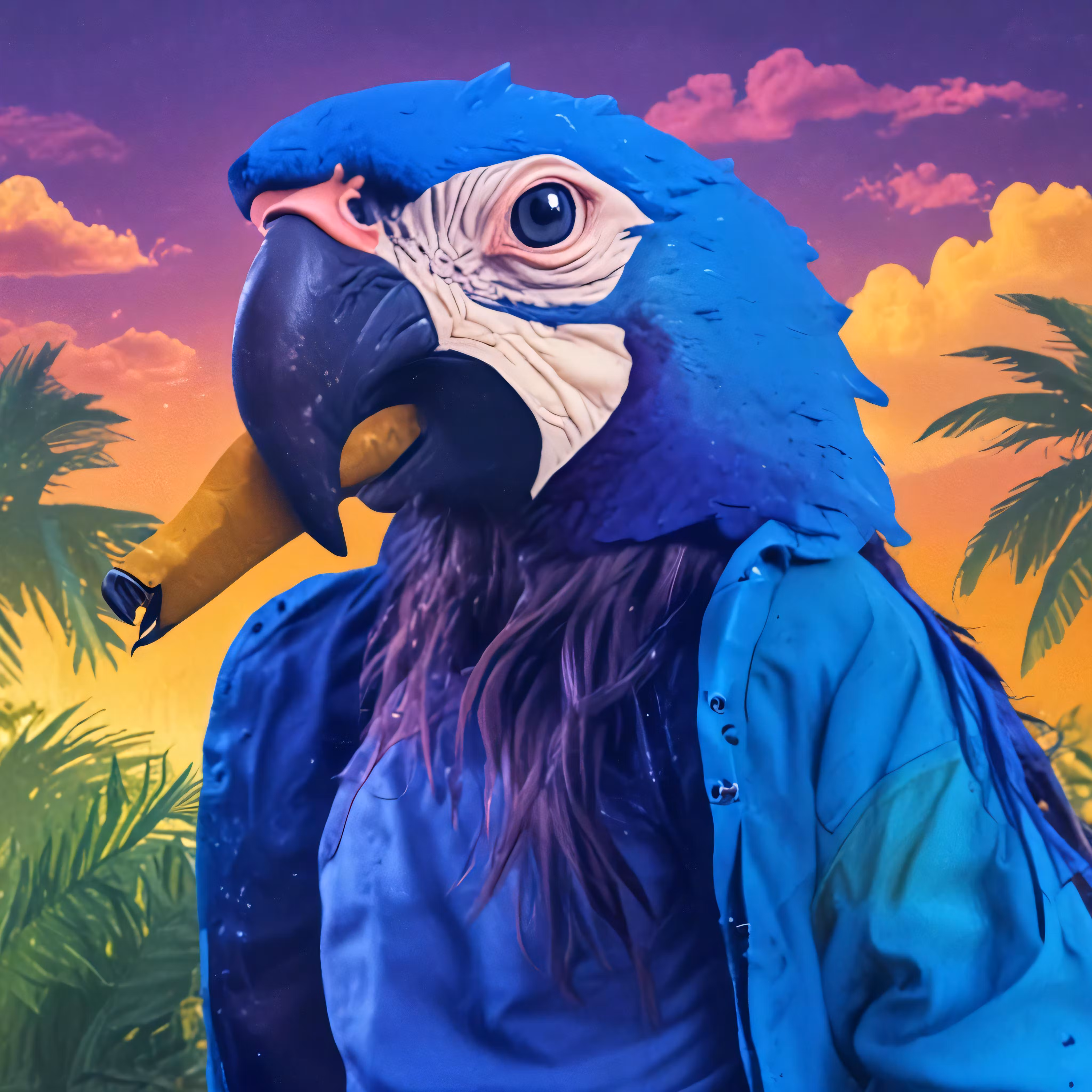 High resolution picture, free to use, a colorful parrot standing in front of palm trees