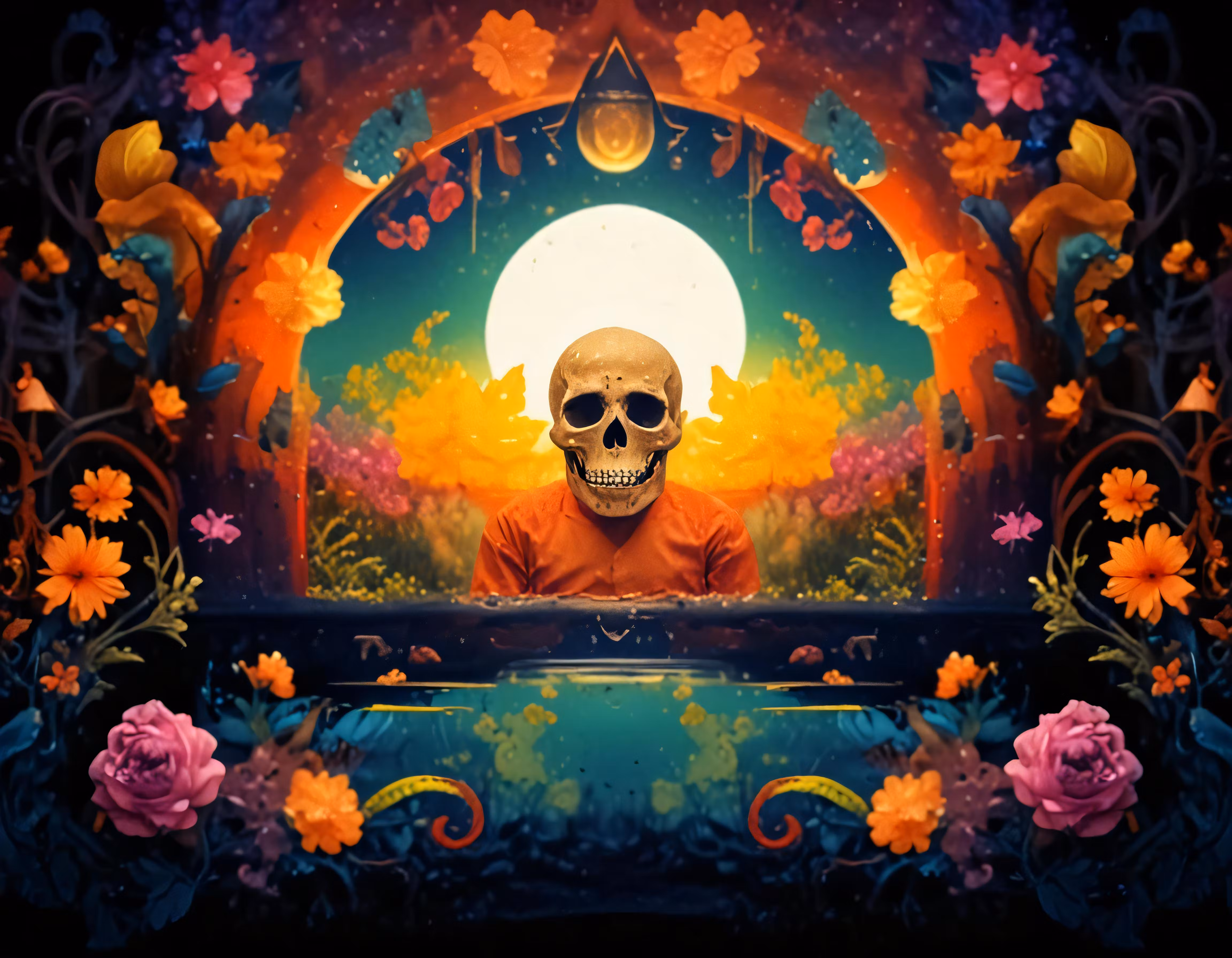 High resolution picture, free to use, a colorful picture of an orange skull in the middle of a flowered tunnel