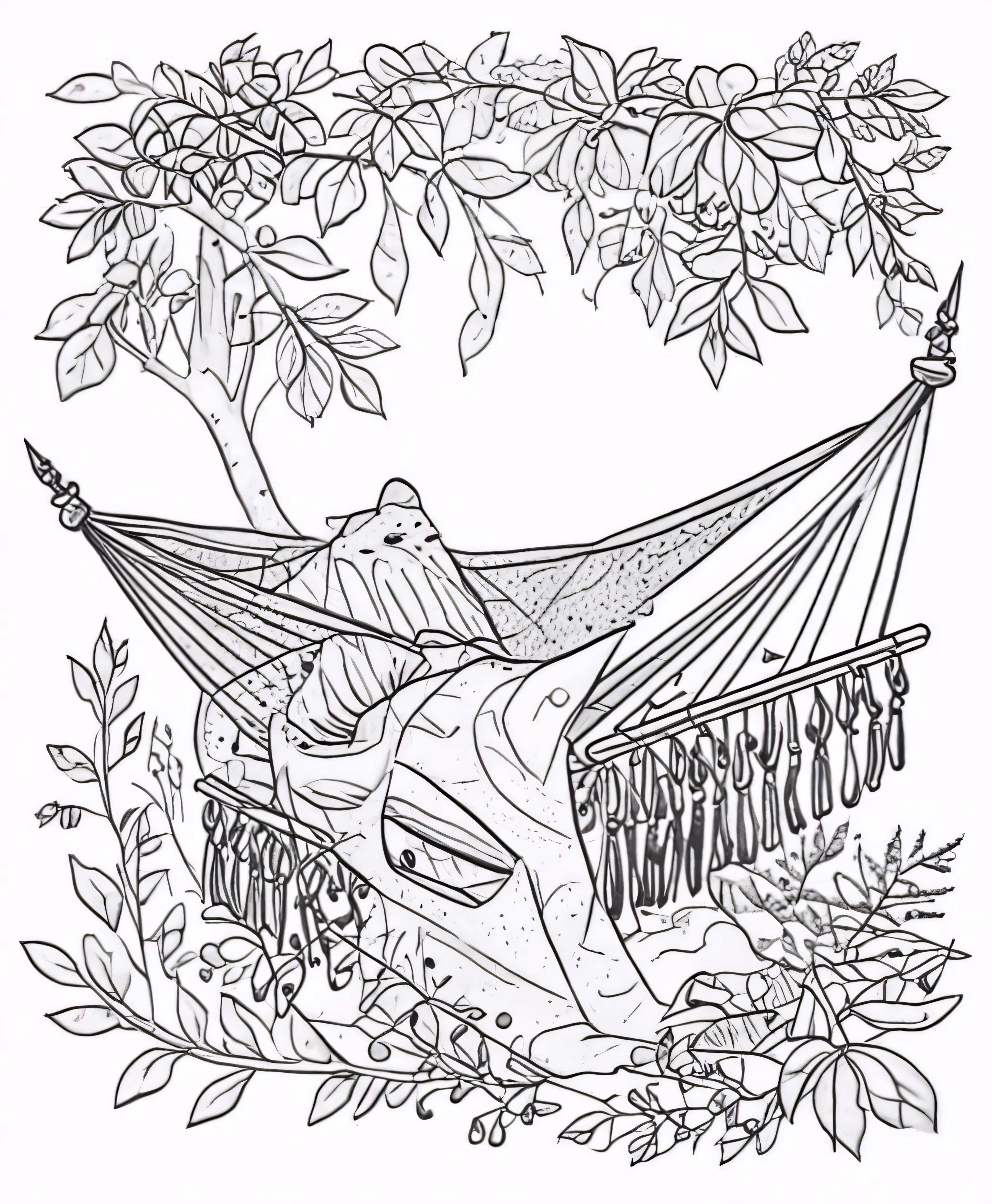 High resolution picture, free to use, a coloring page for adults with a person laying in a hammock