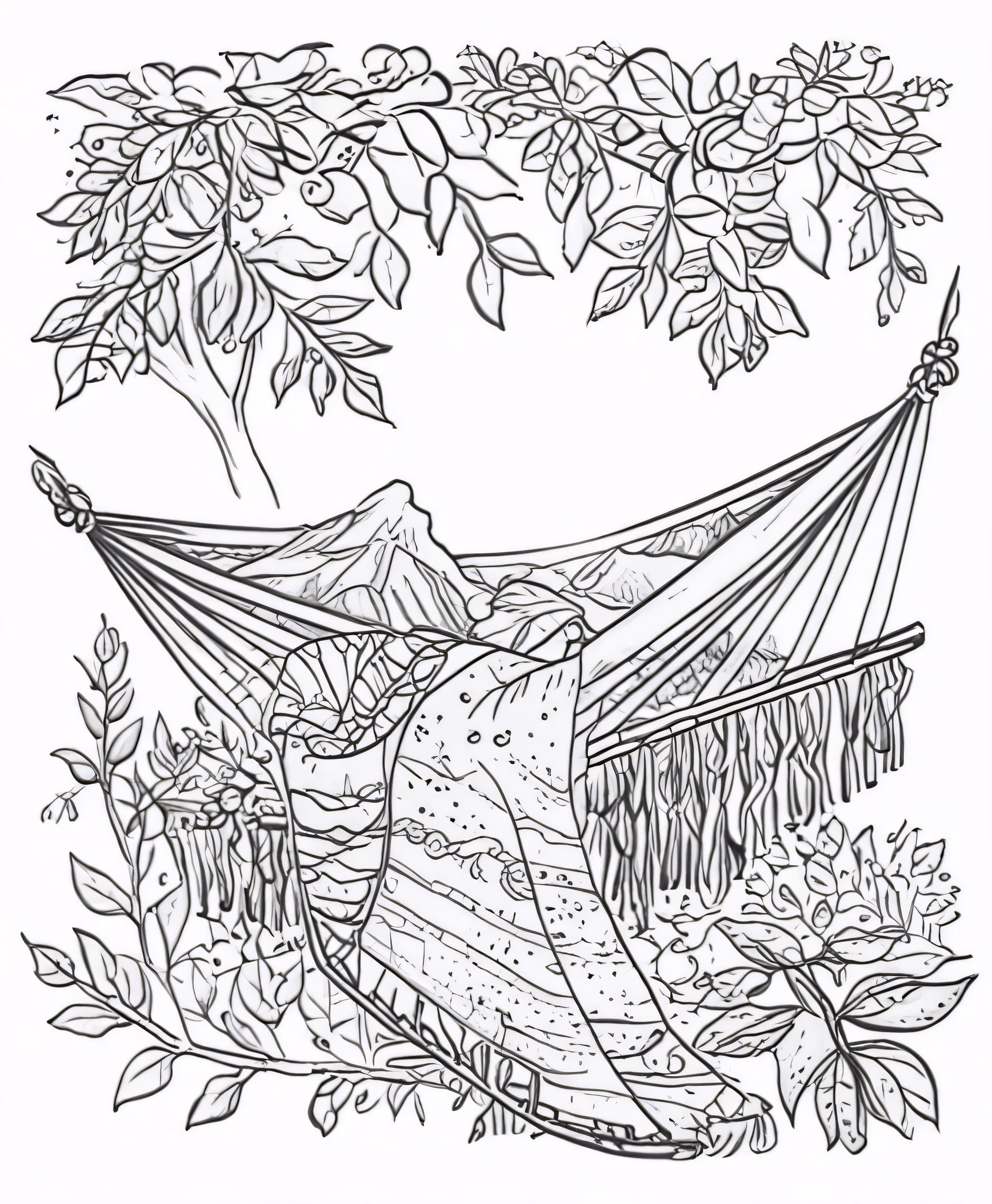 High resolution picture, free to use, a coloring page of a hammock with mountains and trees
