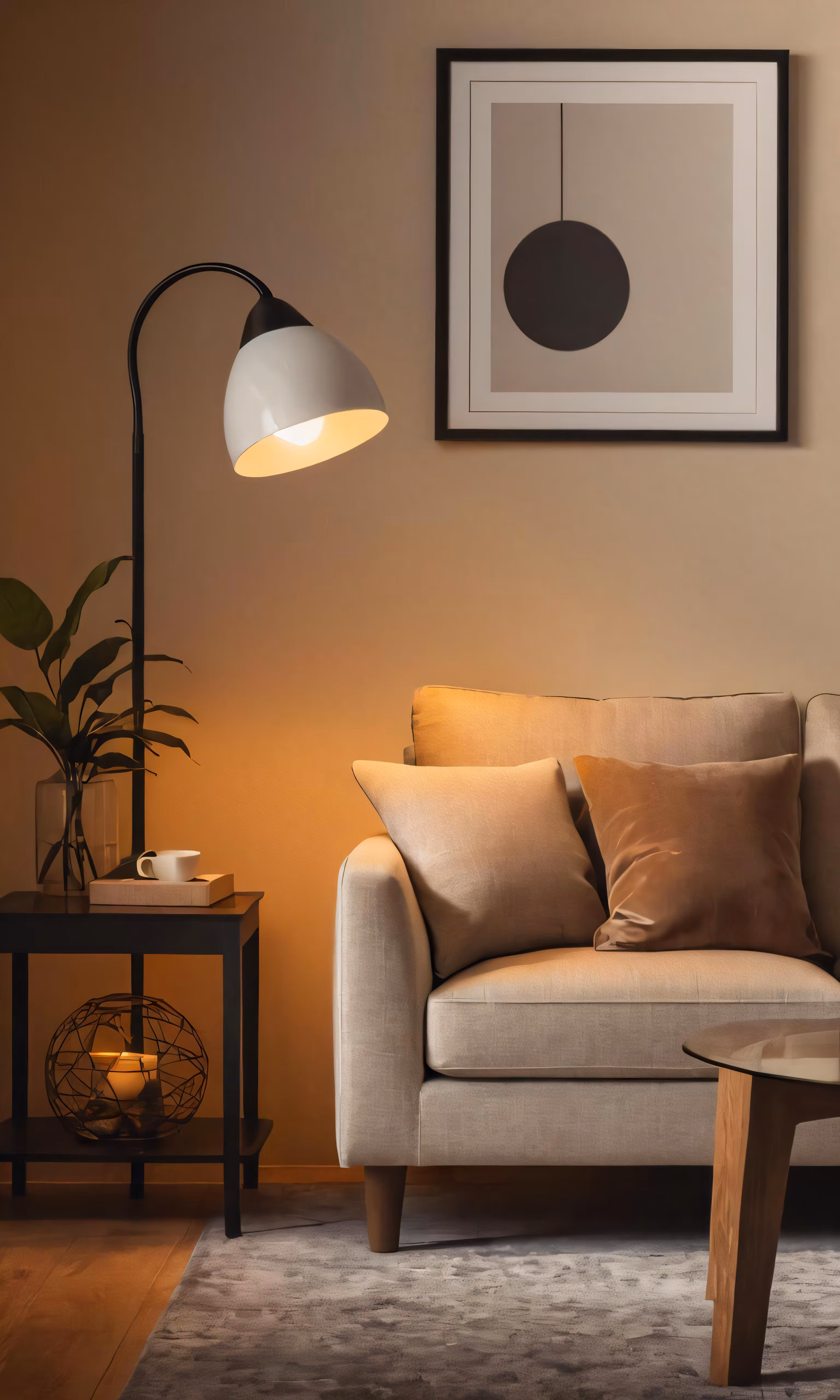 High resolution picture, free to use, a couch with a beige linen and pillows, a coffee table and some lights