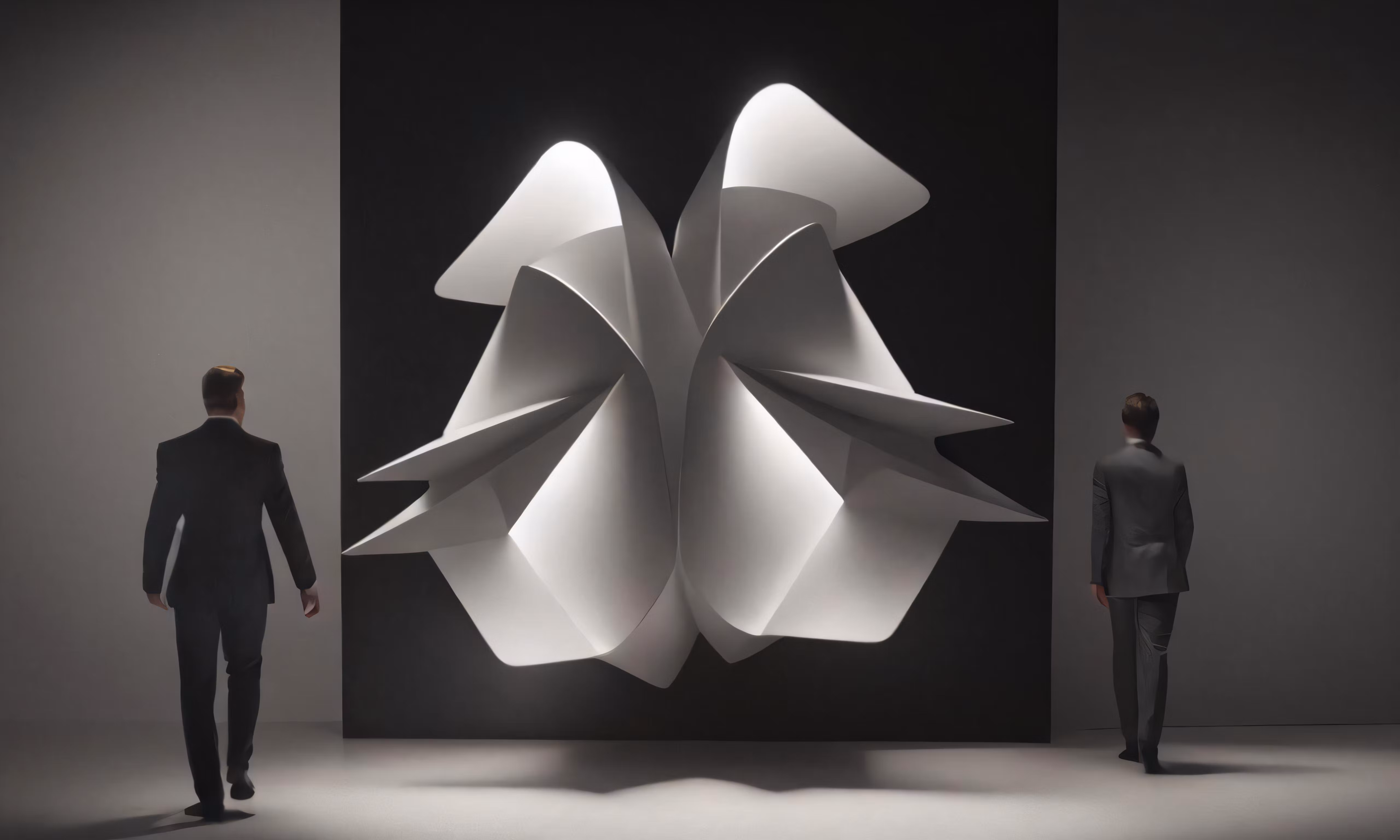 High resolution picture, free to use, a couple of men standing in front of a display with paper sculptures