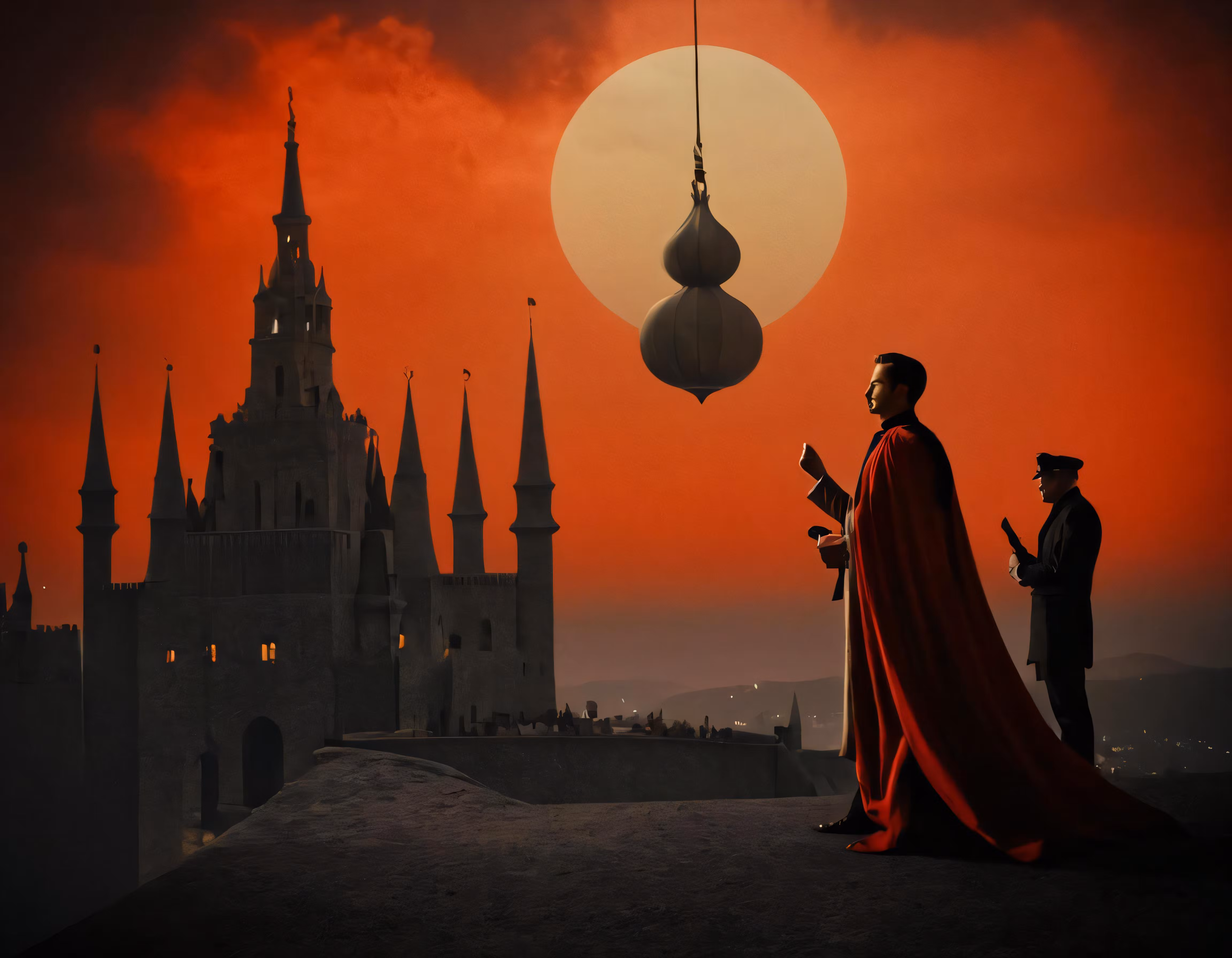 High resolution picture, free to use, a couple of people stand near a castle with sunset
