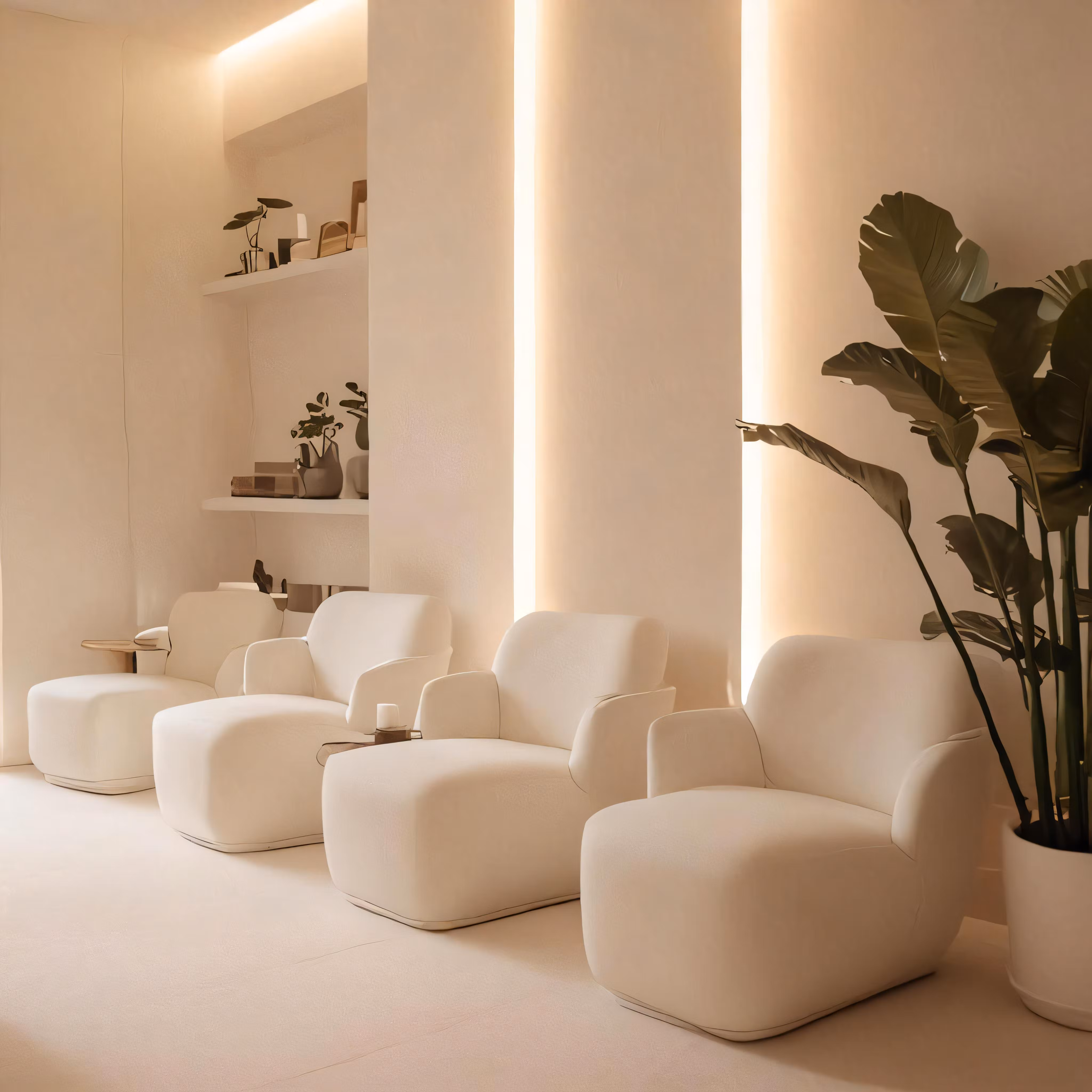 High resolution picture, free to use, a couple of white chairs sitting under a light