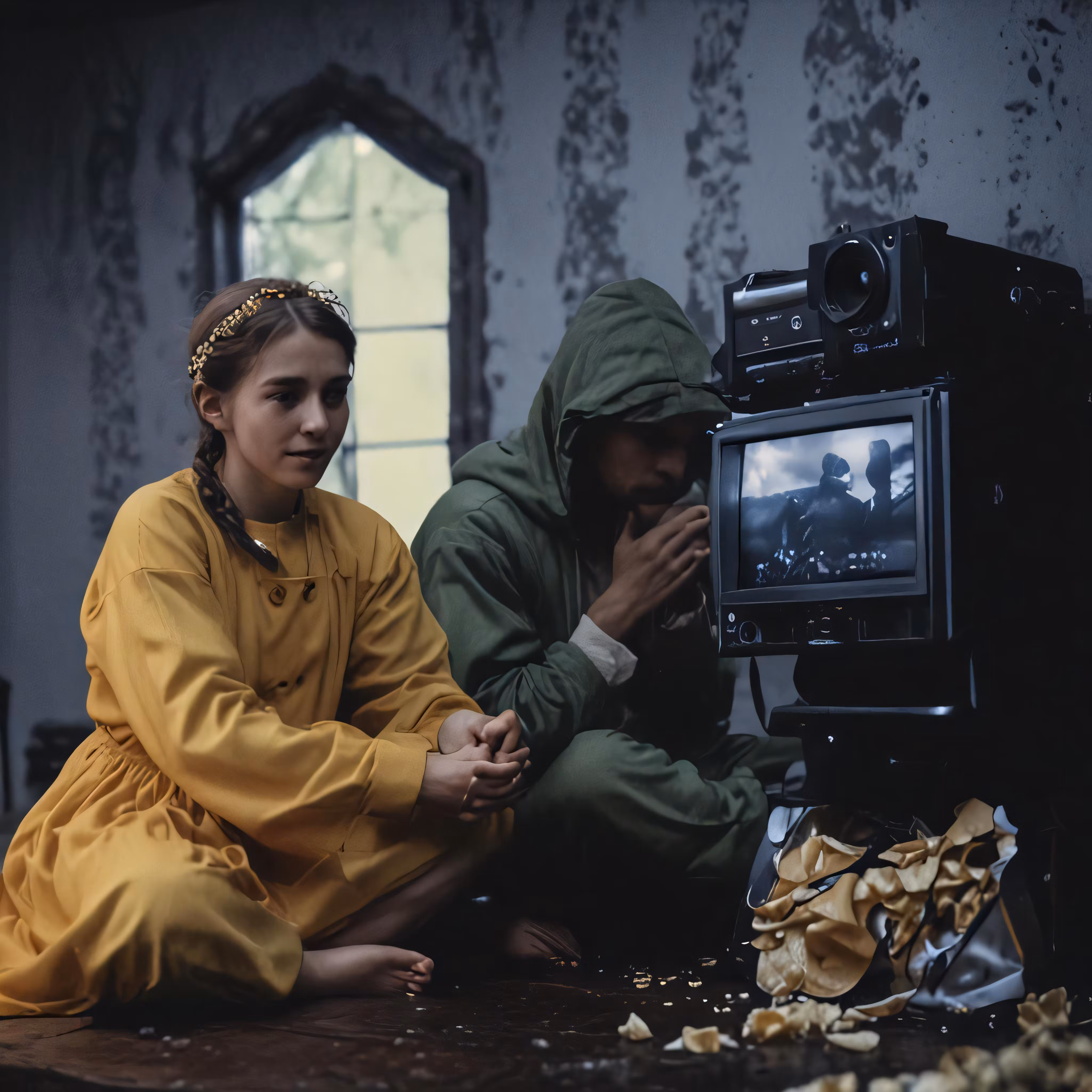 High resolution picture, free to use, a couple sits on the floor of a building while a camera operator is filming something in front of them