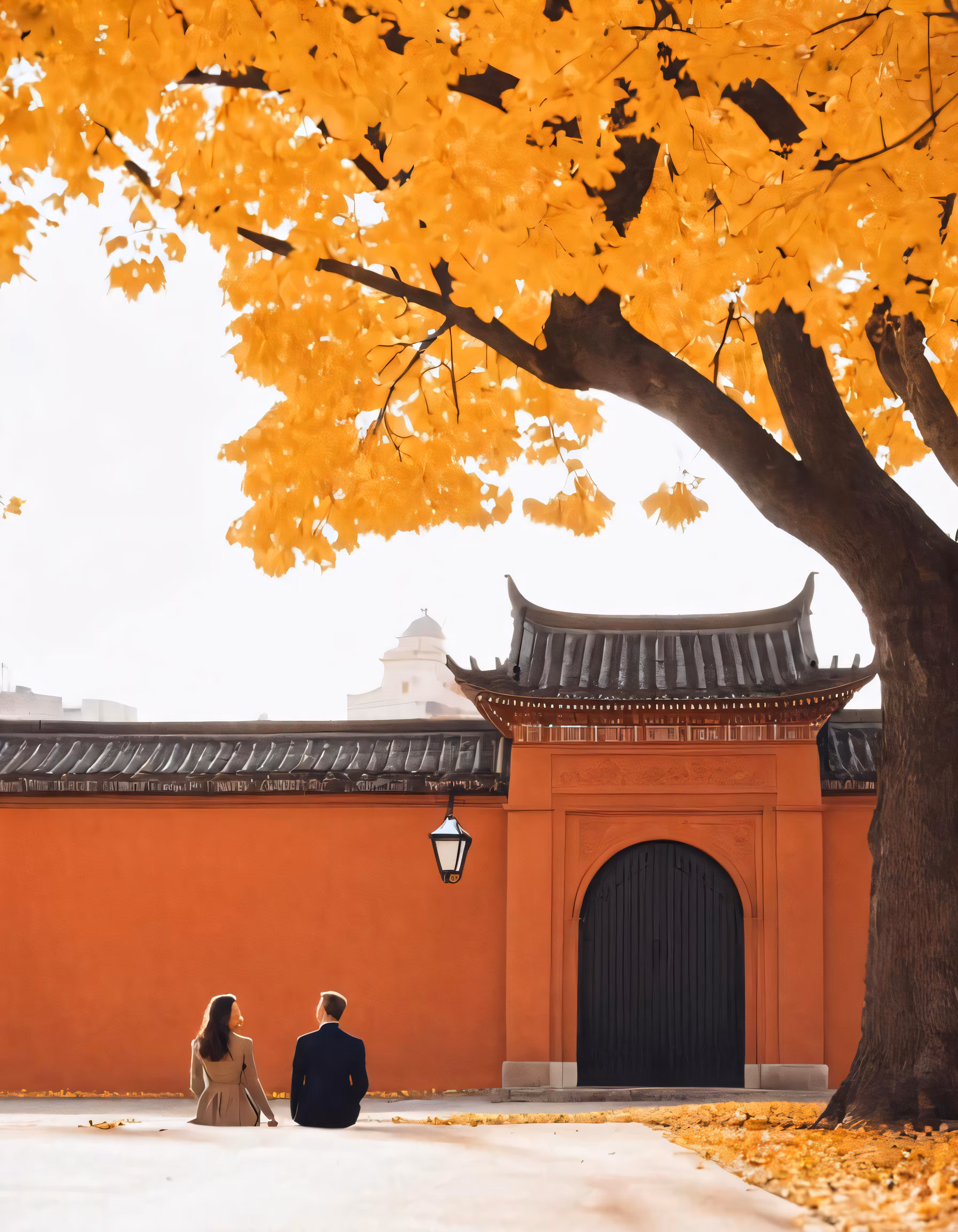 High resolution picture, free to use, a couple sitting underneath the yellow tree