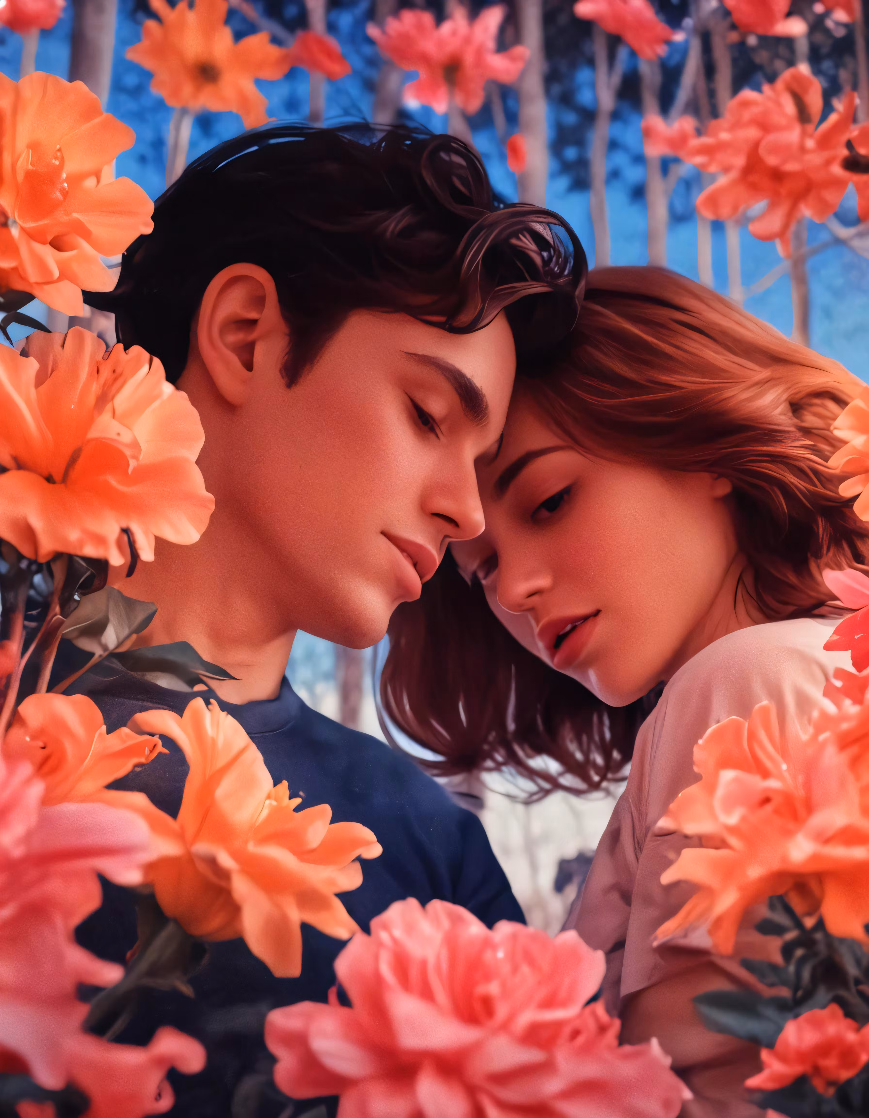 High resolution picture, free to use, a couple standing among flowers with an umbrella overhead