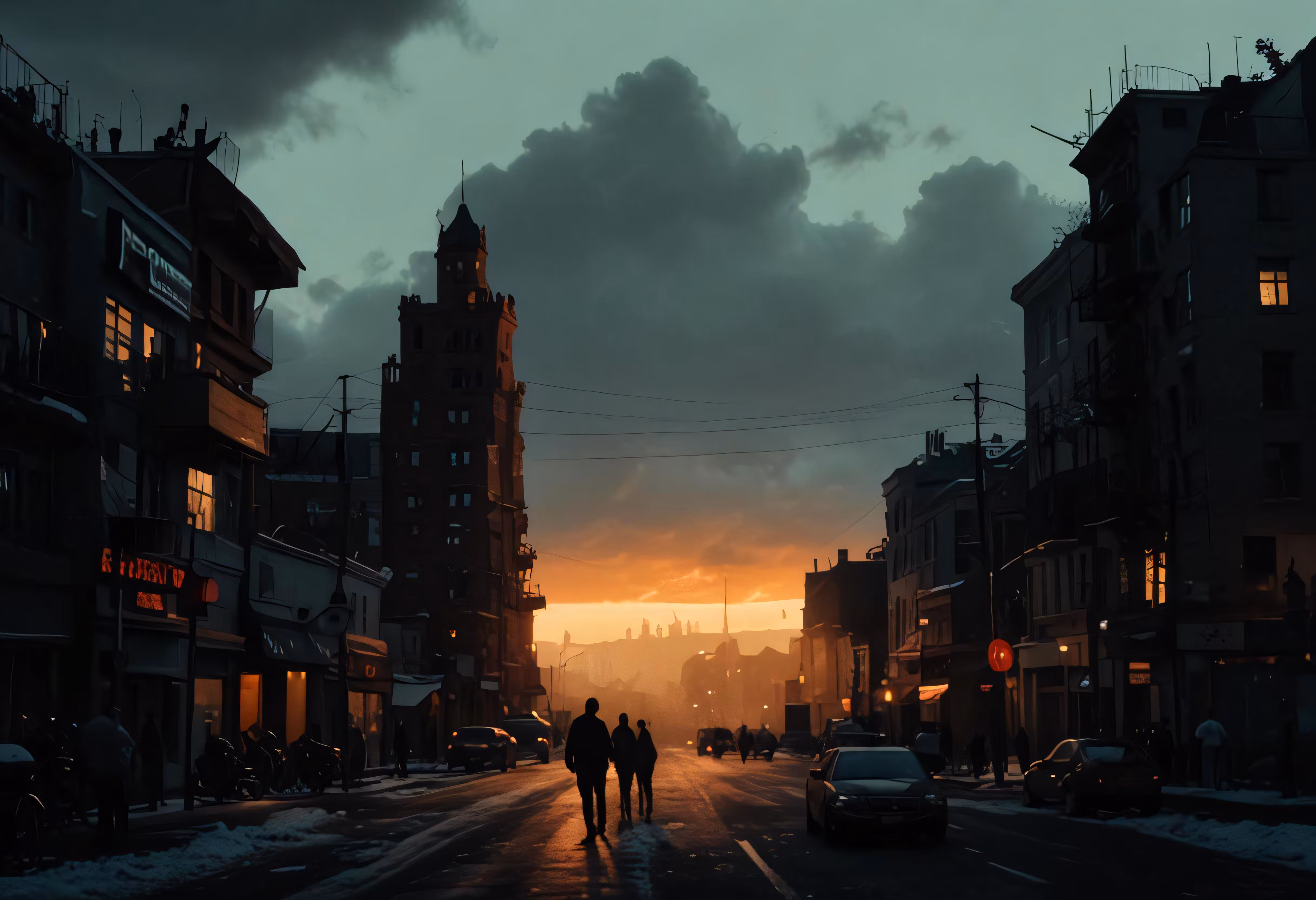 High resolution picture, free to use, a couple walking along a street near tall buildings at dusk