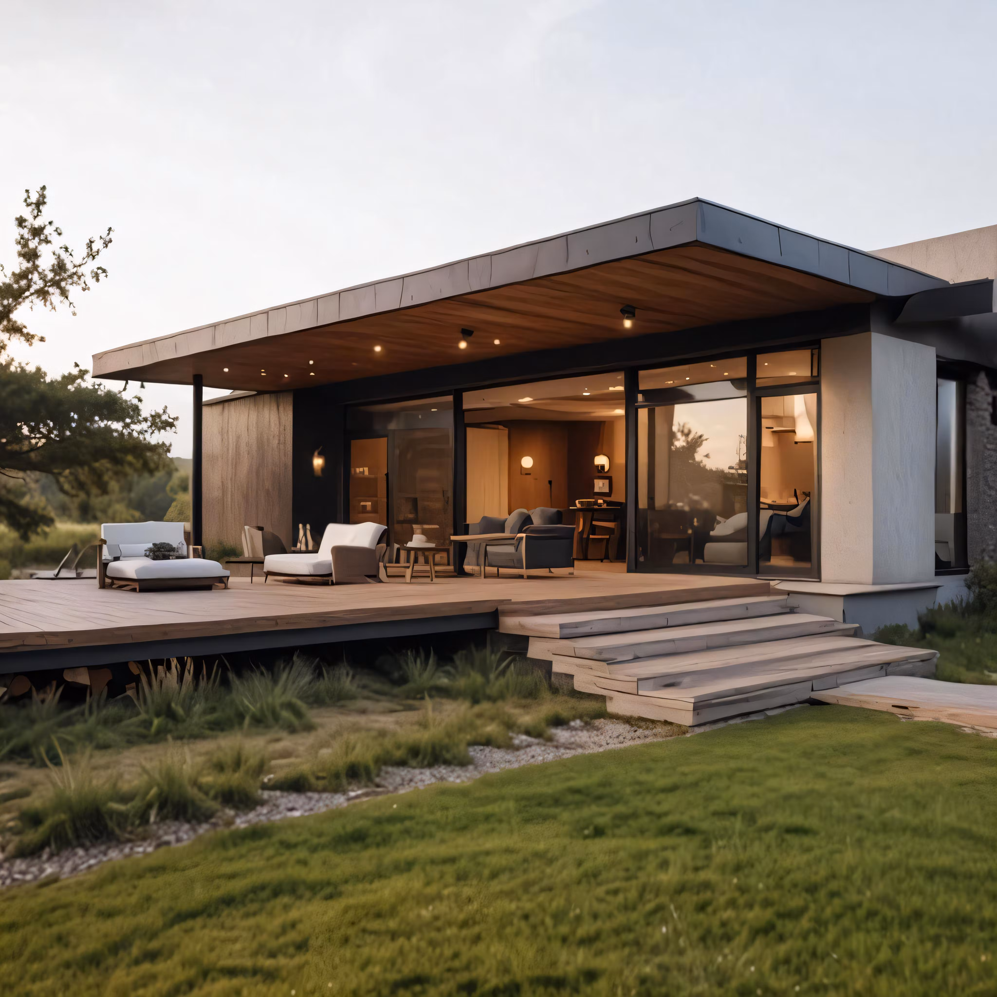High resolution picture, free to use, a covered patio with seating and steps leading to the living area