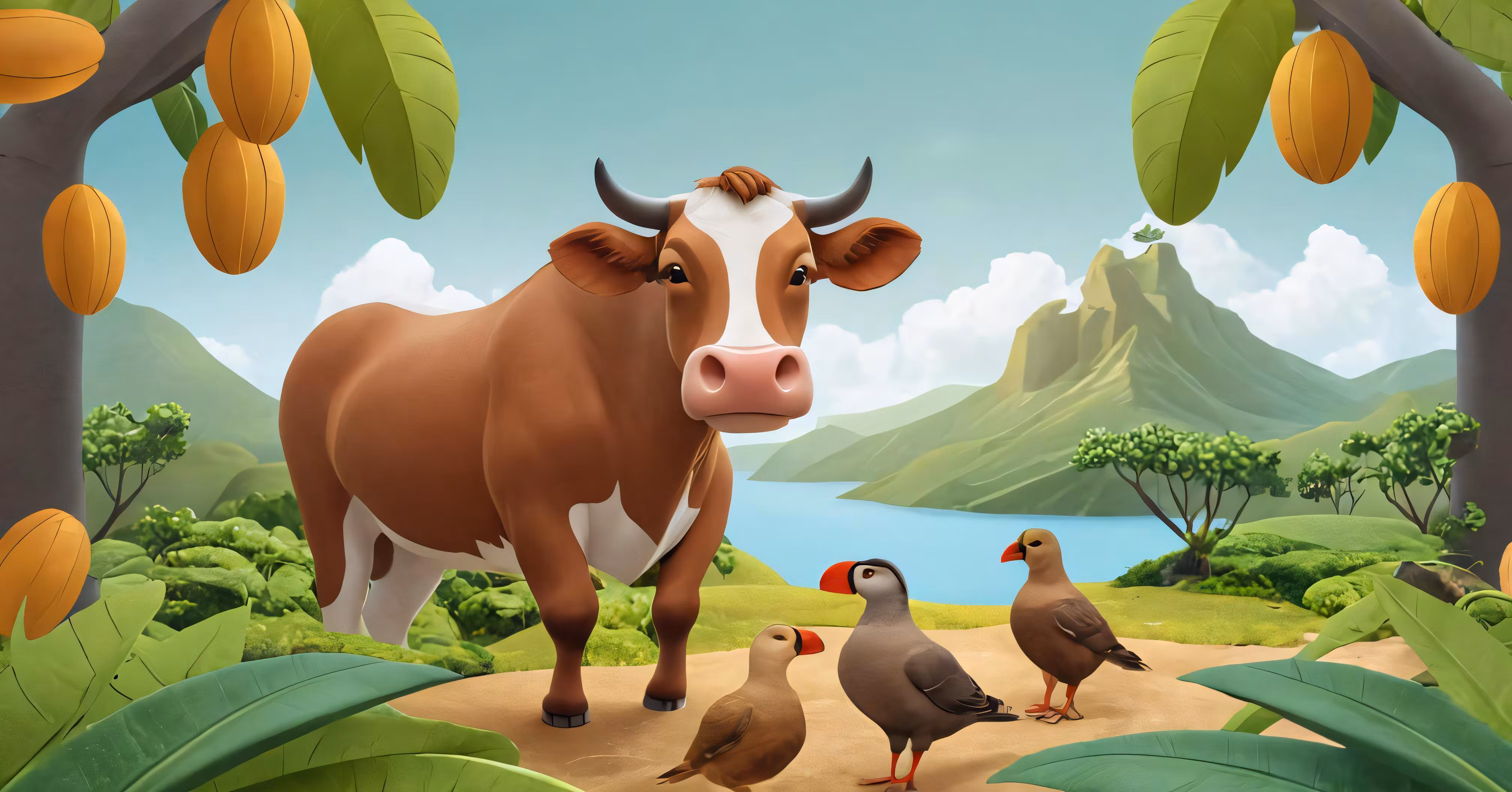 High resolution picture, free to use, a cow, duck and bird in a forest
