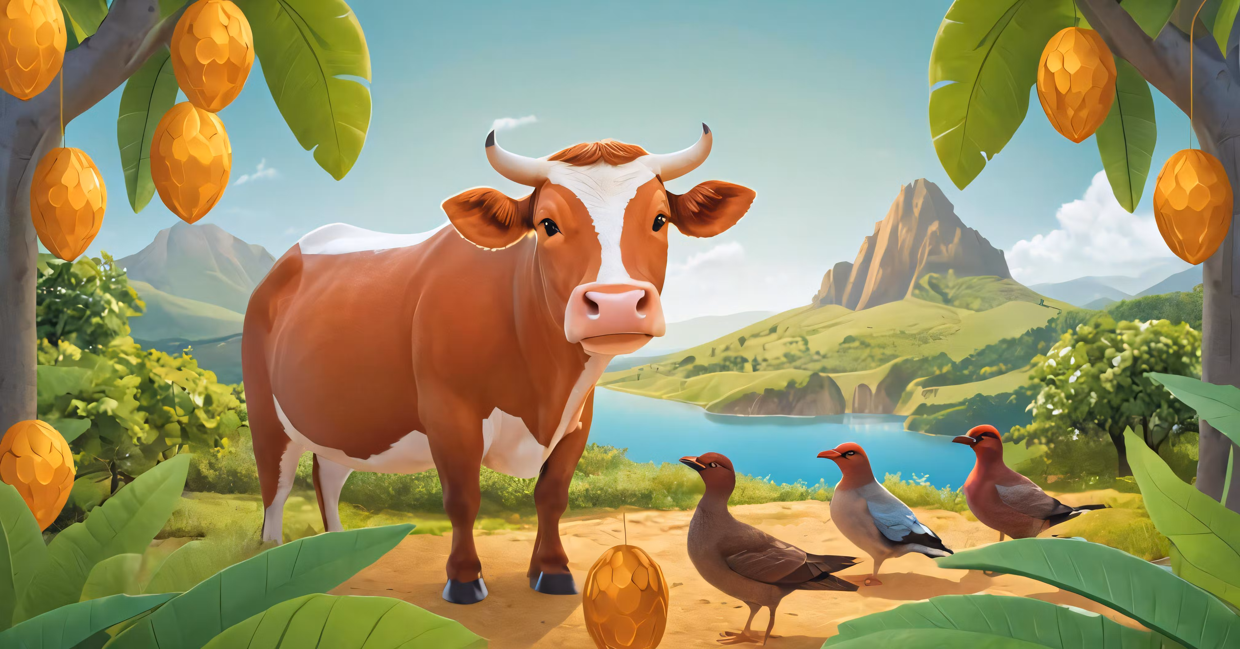 High resolution picture, free to use, a cow and geese in an animated field