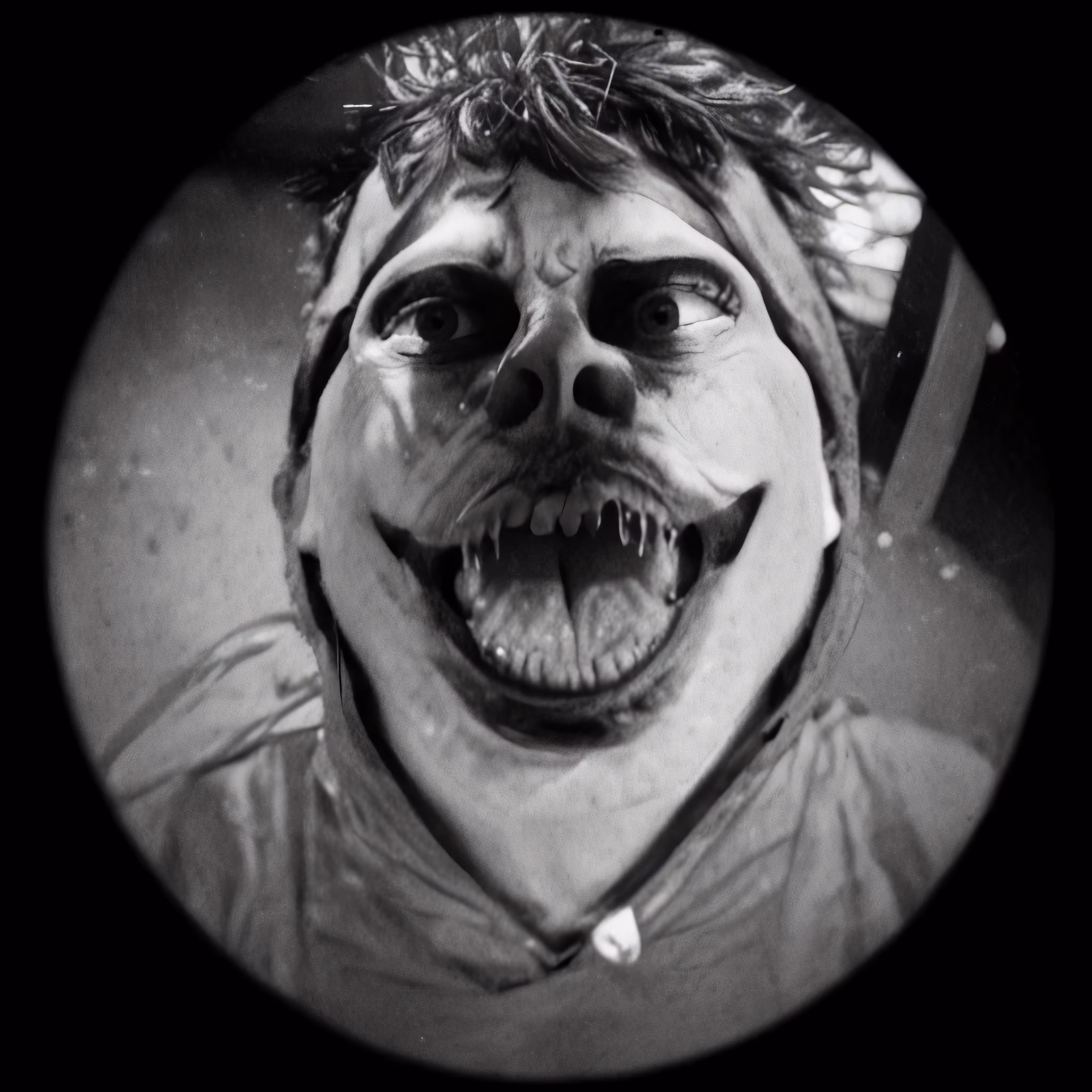 High resolution picture, free to use, a creepy clown is pictured in this black and white photo