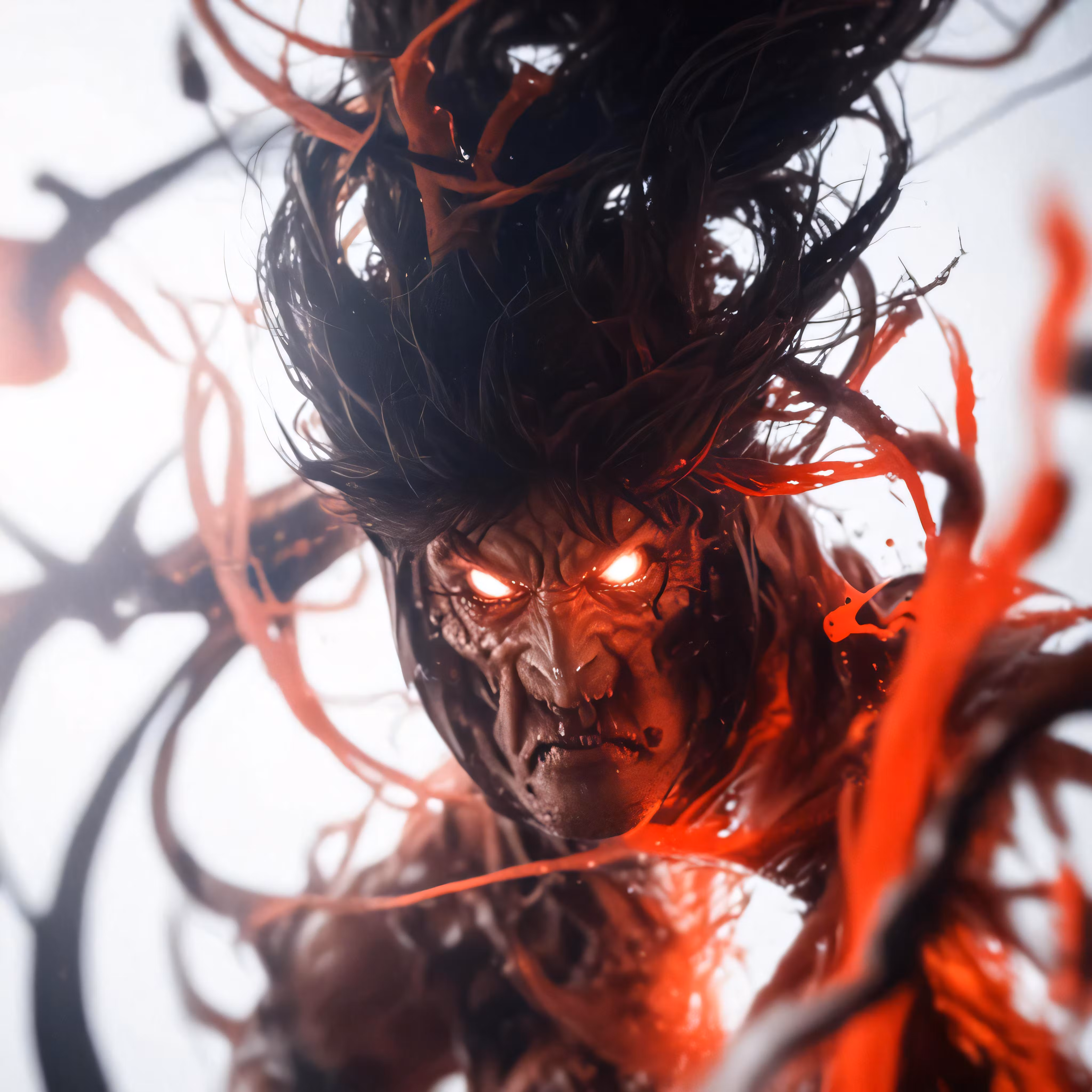 High resolution picture, free to use, a creepy looking figure with red eyes with dark hair