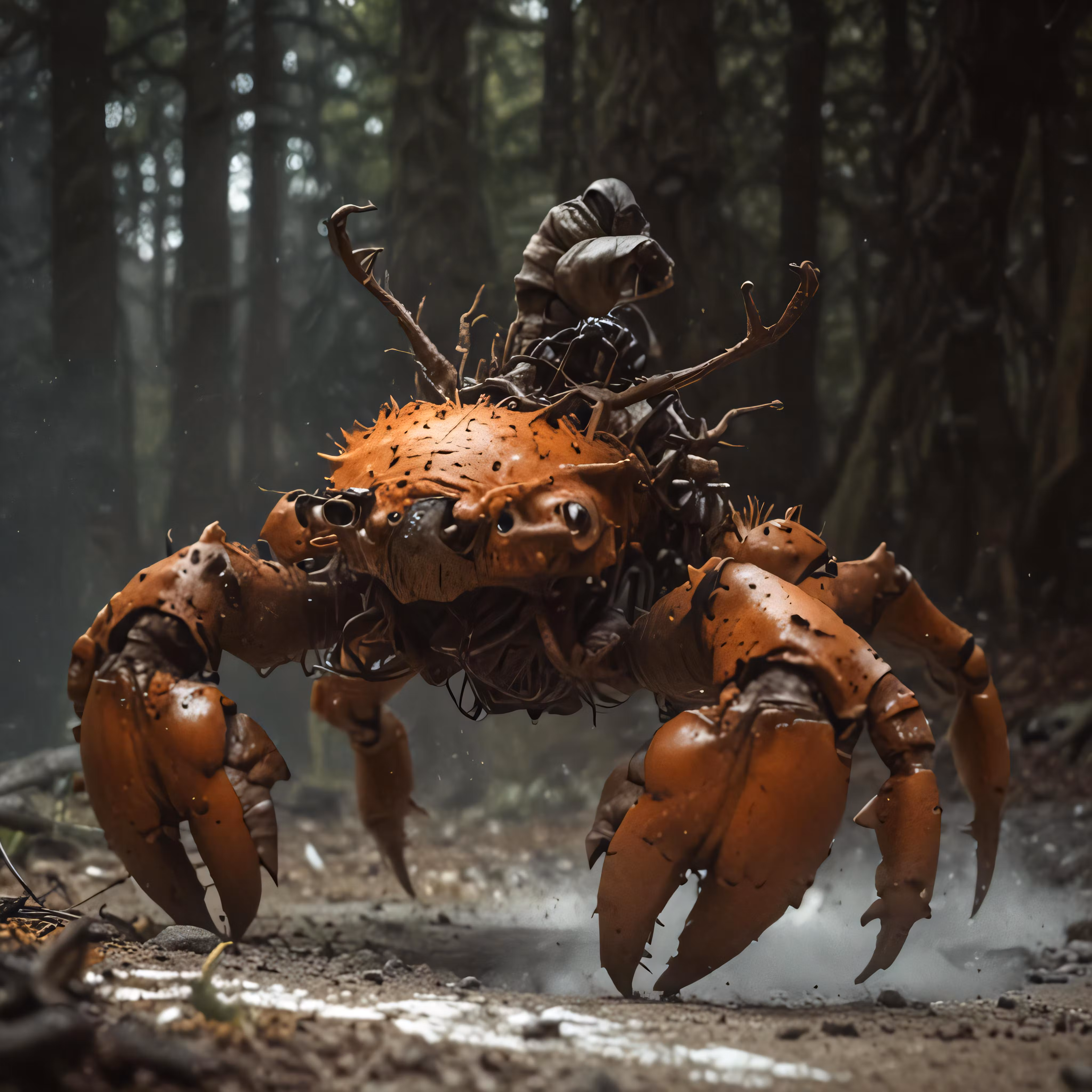 High resolution picture, free to use, a creepy orange, weird looking robot walking through the woods