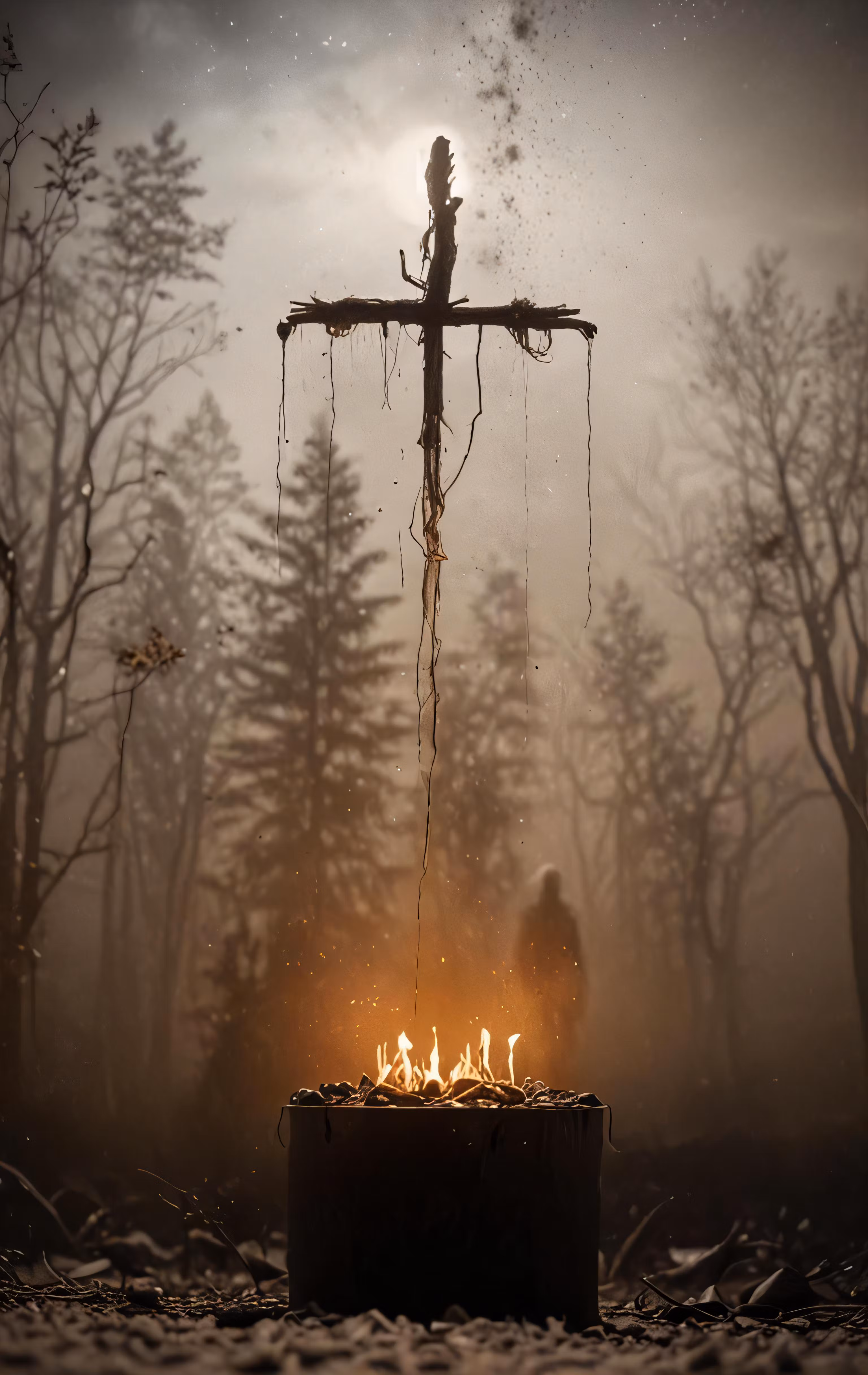High resolution picture, free to use, a cross on a snowy hill with the light of the cross