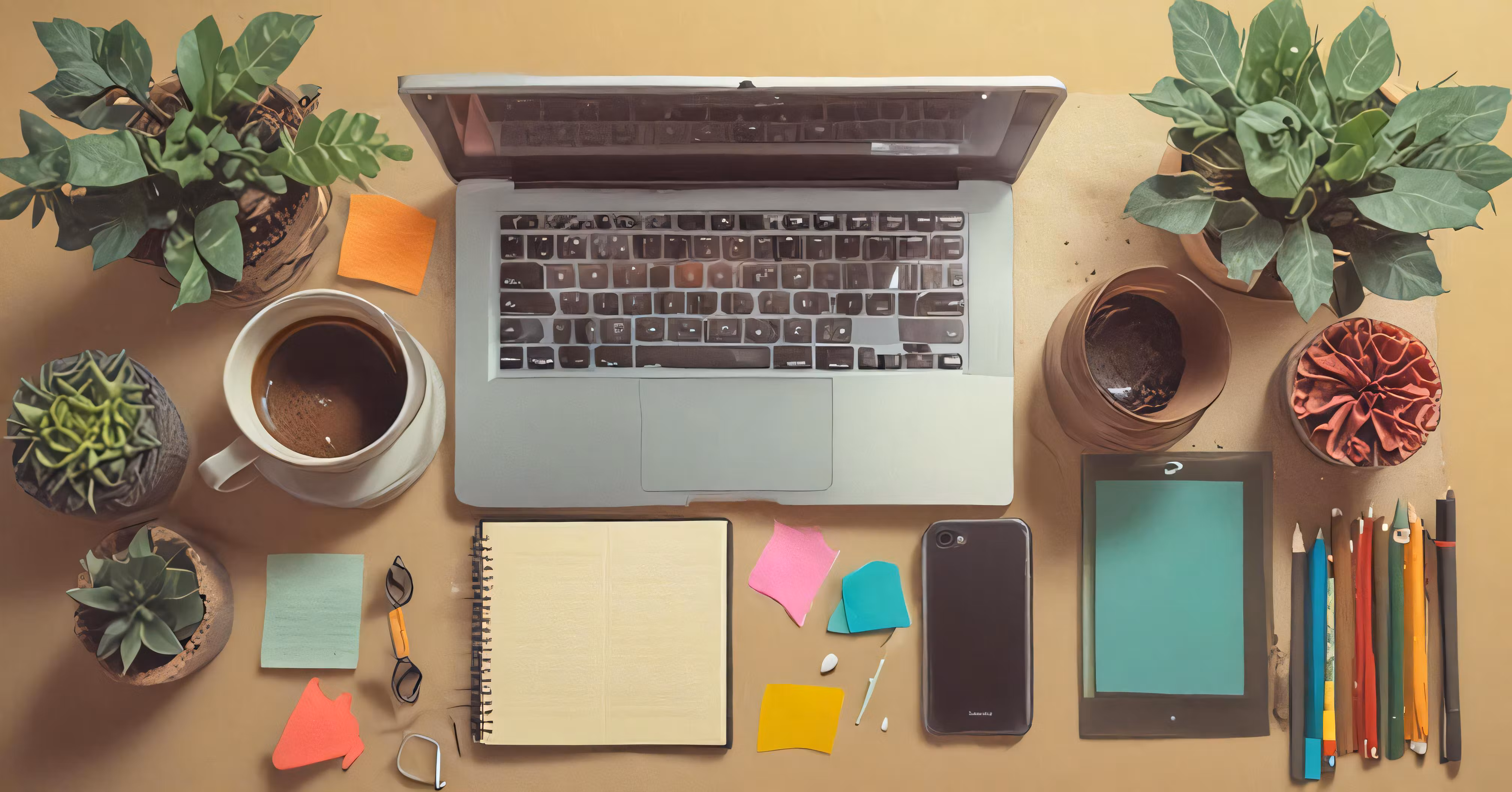 High resolution picture, free to use, a cup and some pens a laptop and other items