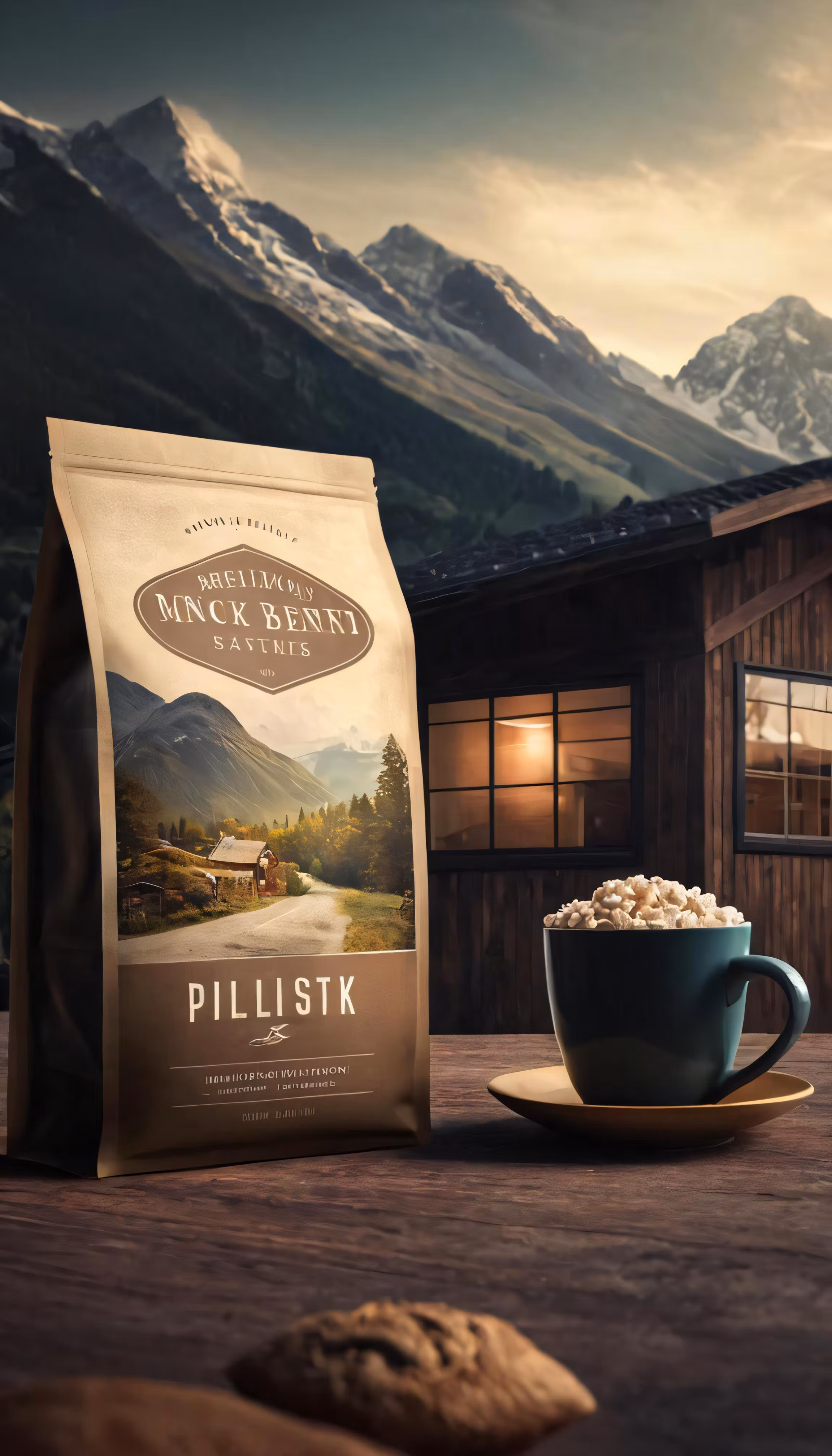 High resolution picture, free to use, a cup of coffee sits on the table next to a bag of pills