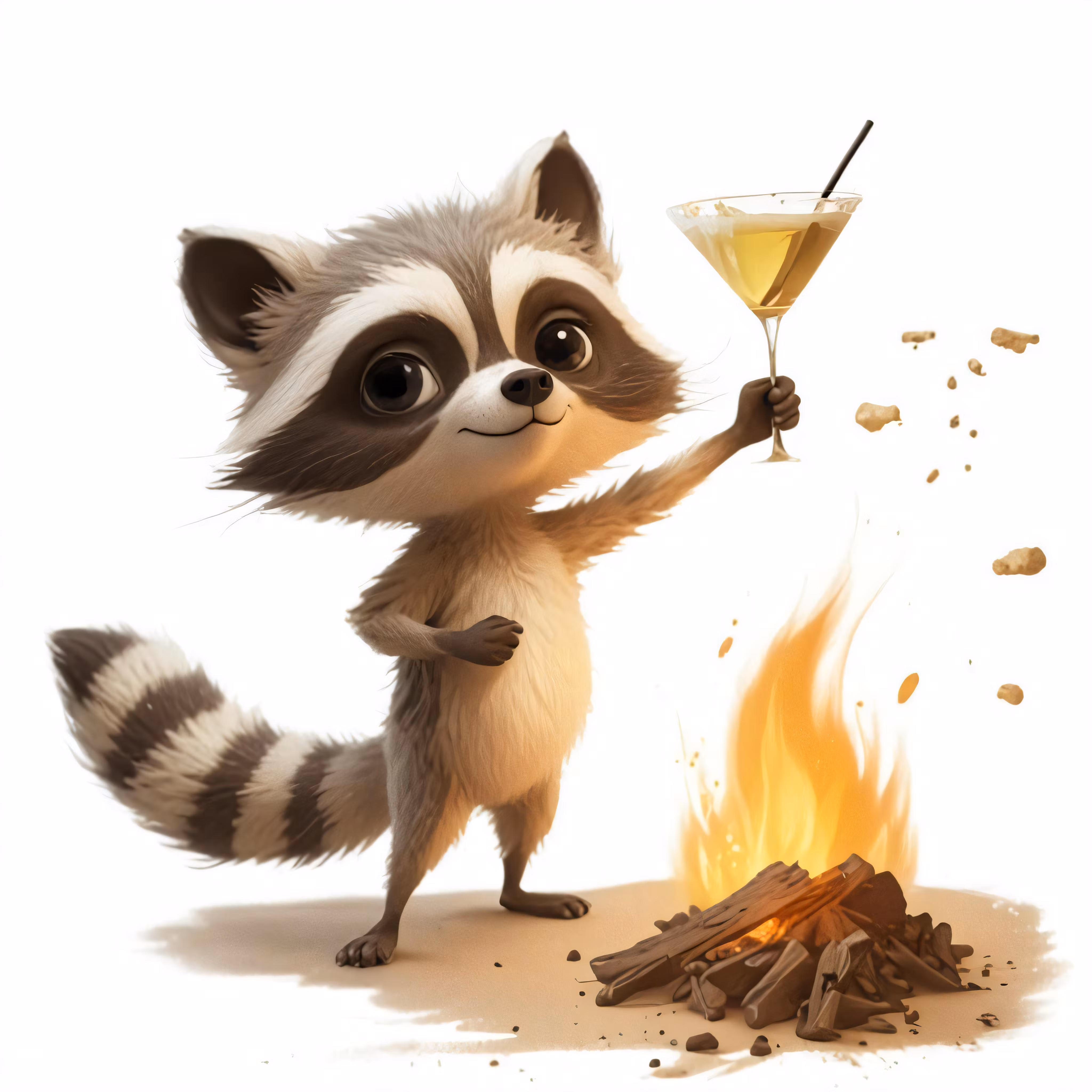 High resolution picture, free to use, a cute raccoon holds a martini glass in front of an open fire