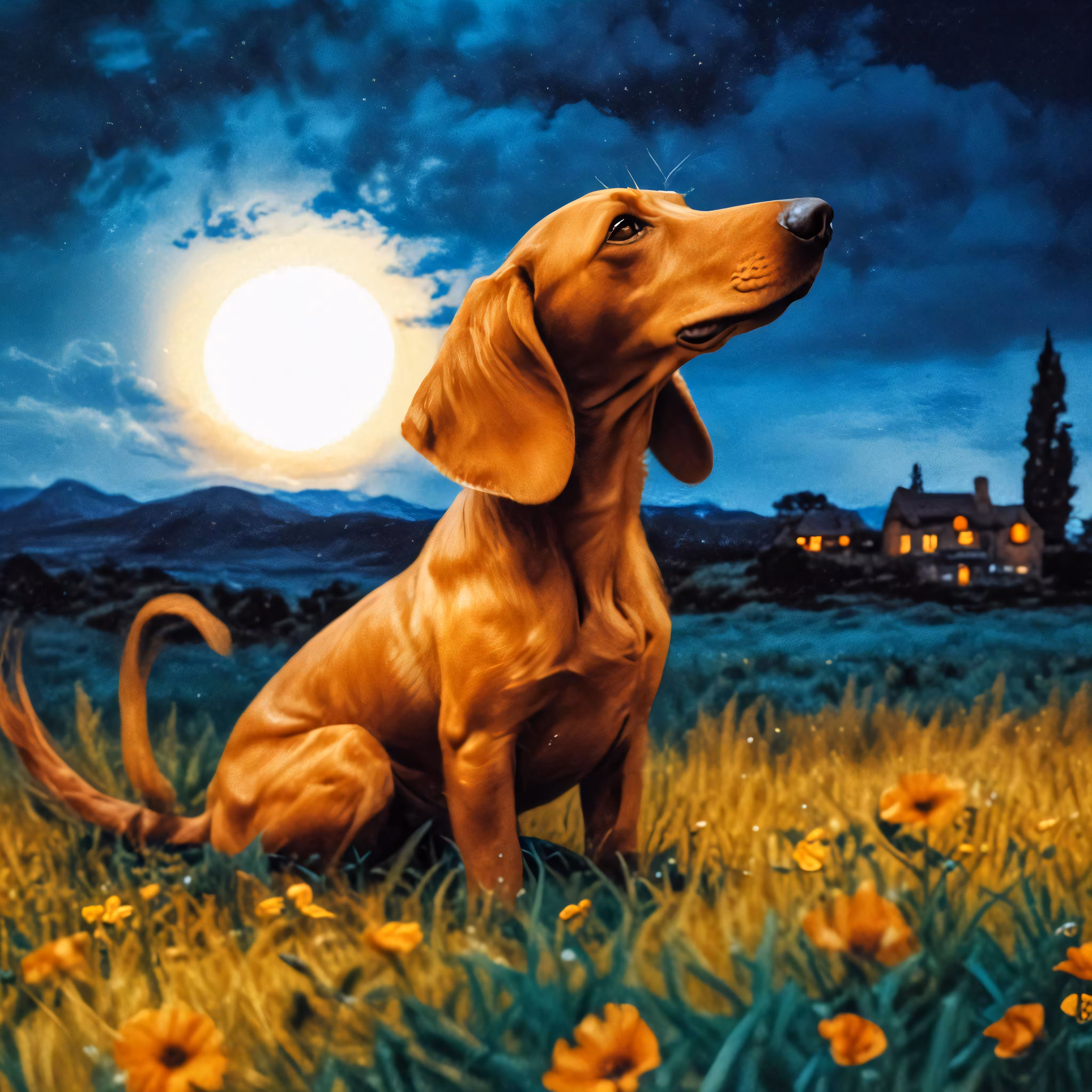 High resolution picture, free to use, a dachshund sits in the grass watching a moon