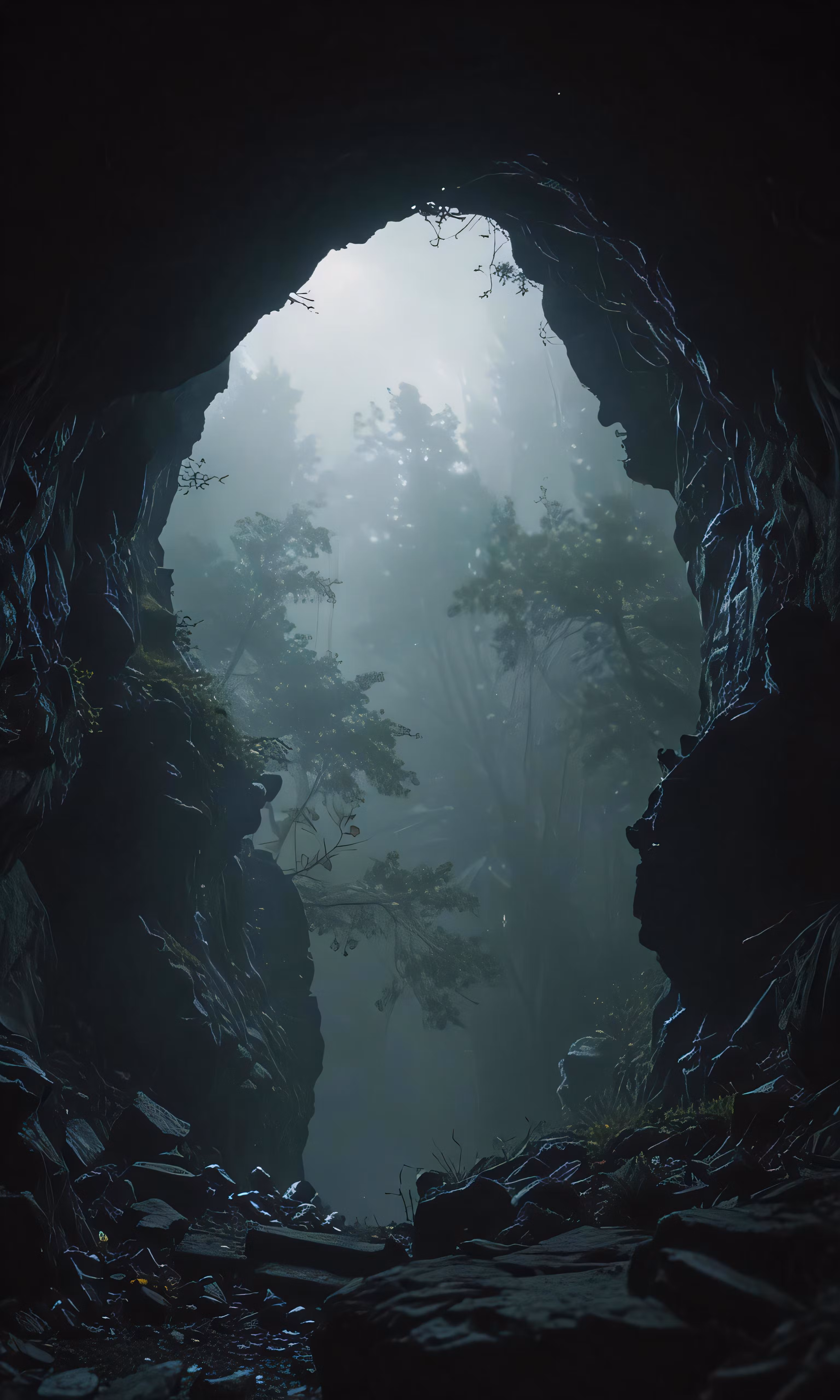 High resolution picture, free to use, a dark cave entrance with the sunlight shining into a jungle