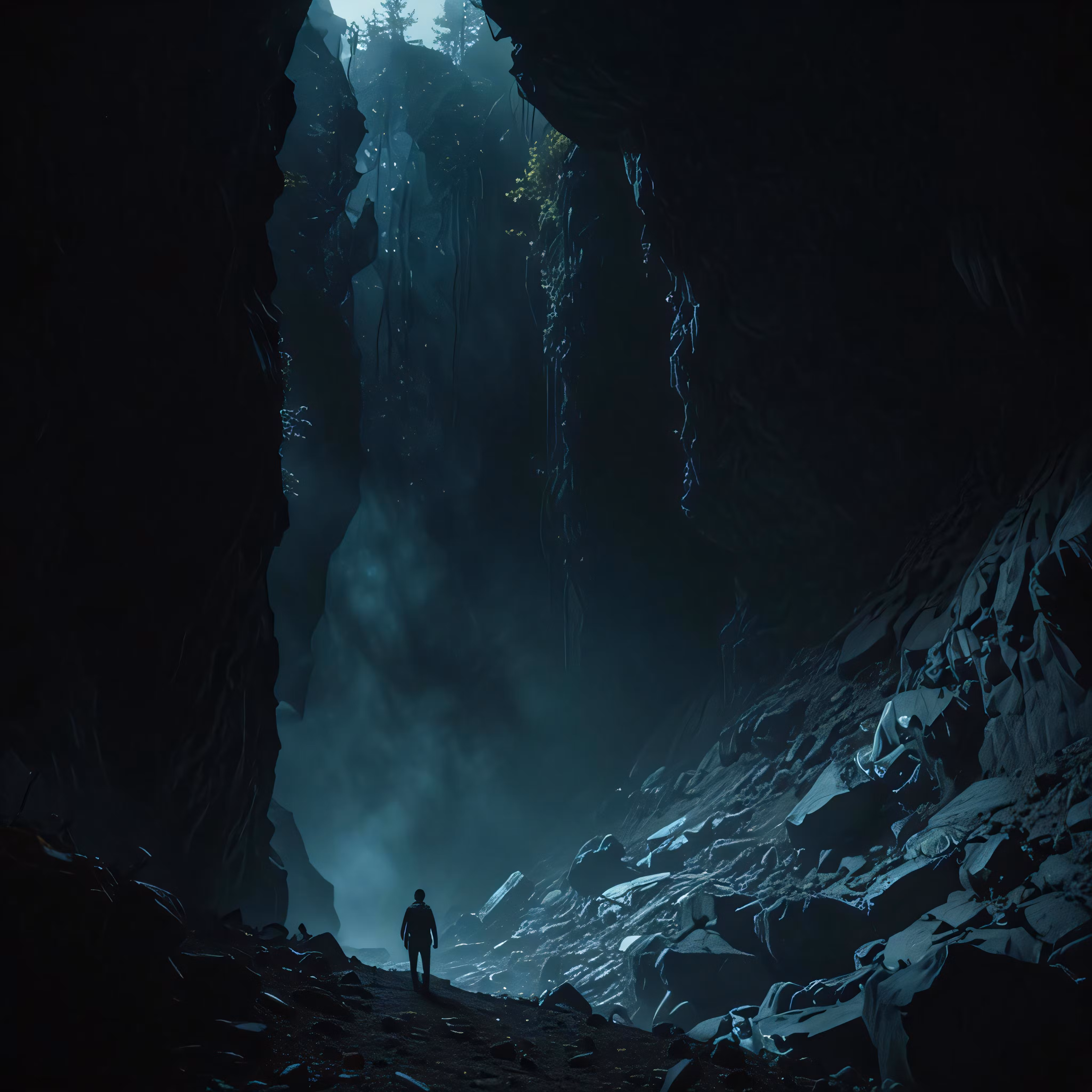 High resolution picture, free to use, a dark cave with an adventurer walking into the entrance