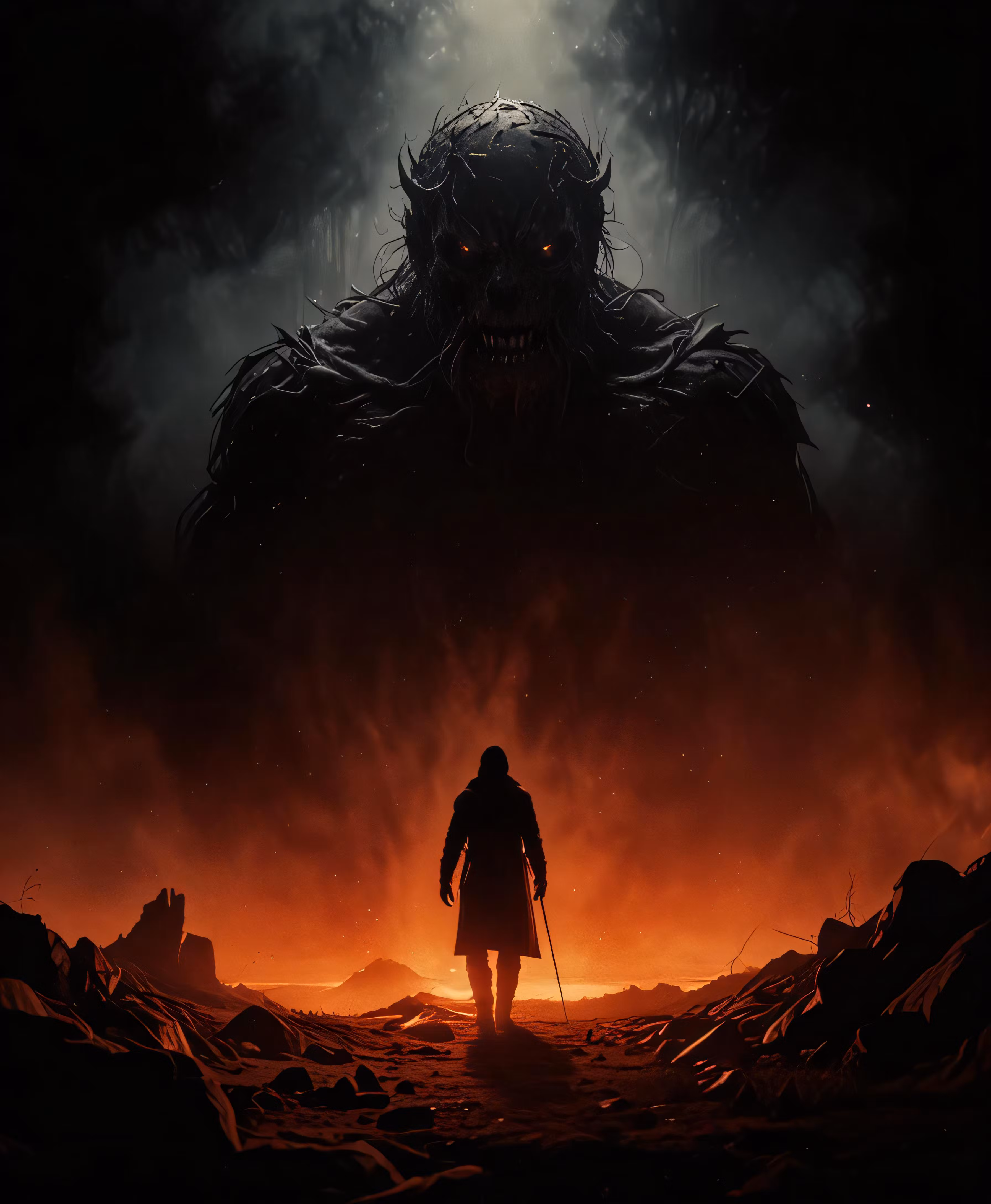 High resolution picture, free to use, a dark skinned man standing in a field next to a giant monster