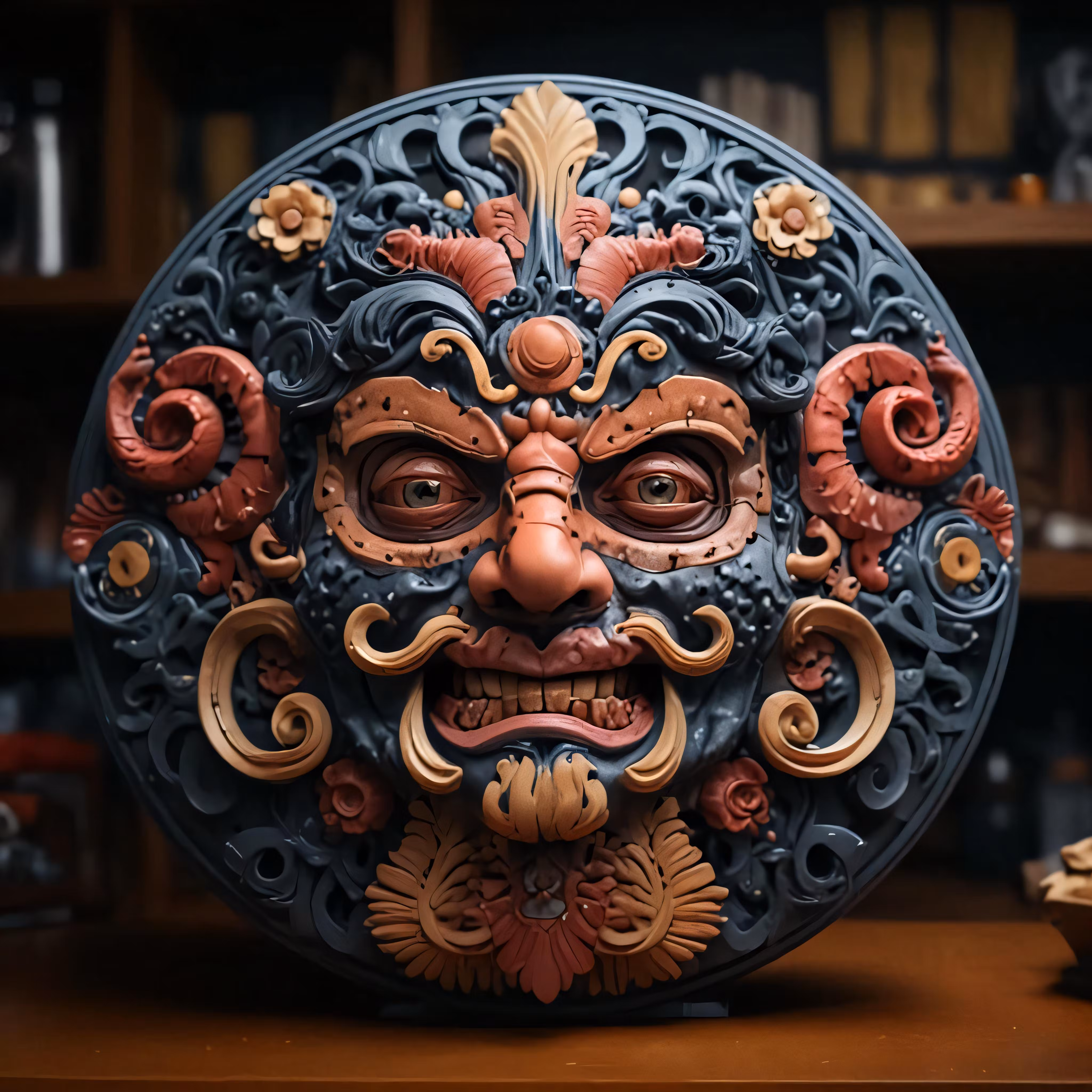 High resolution picture, free to use, a decorative mask is sitting on top of a table