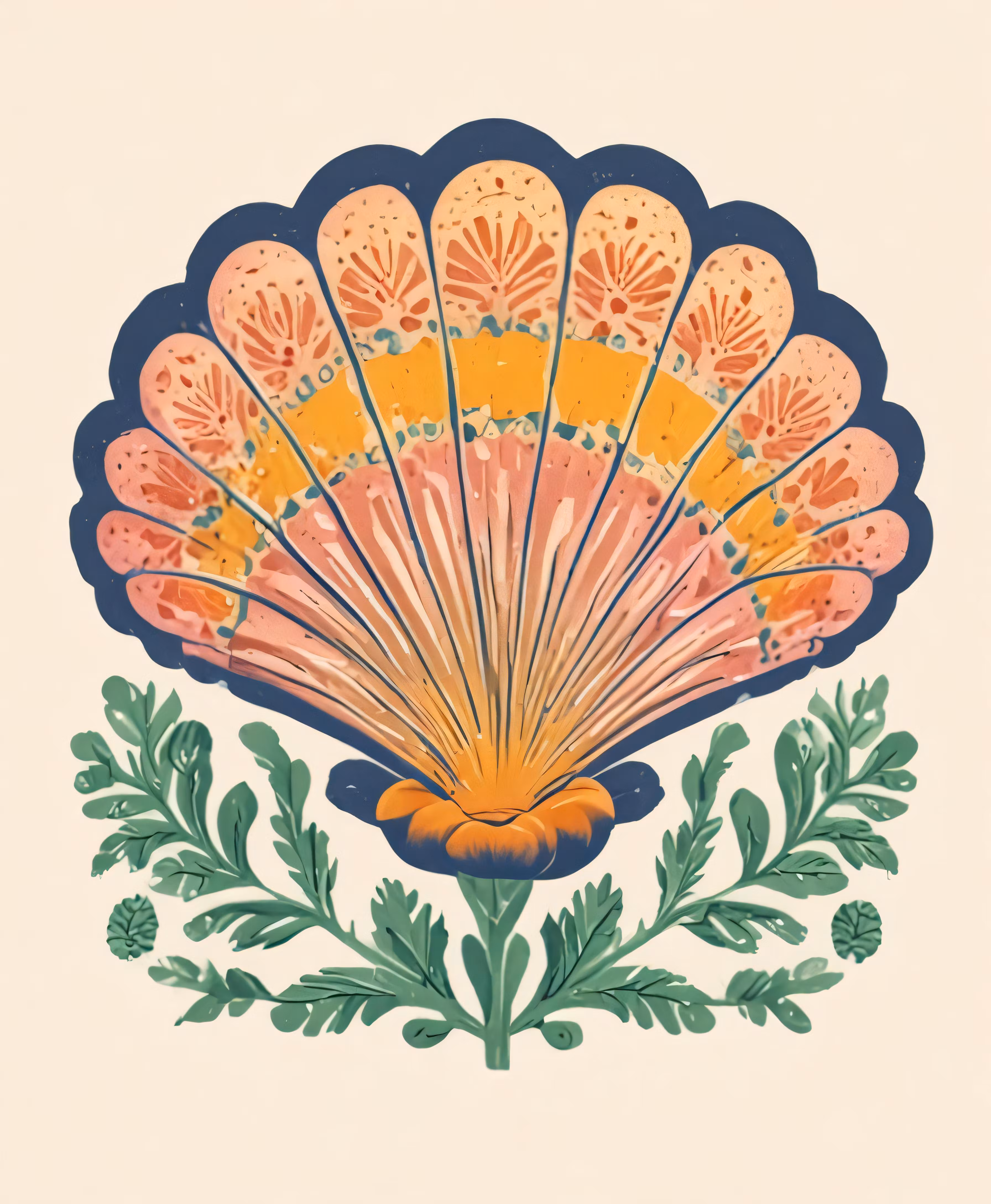 High resolution picture, free to use, a decorative print of a peacock with orange feathers