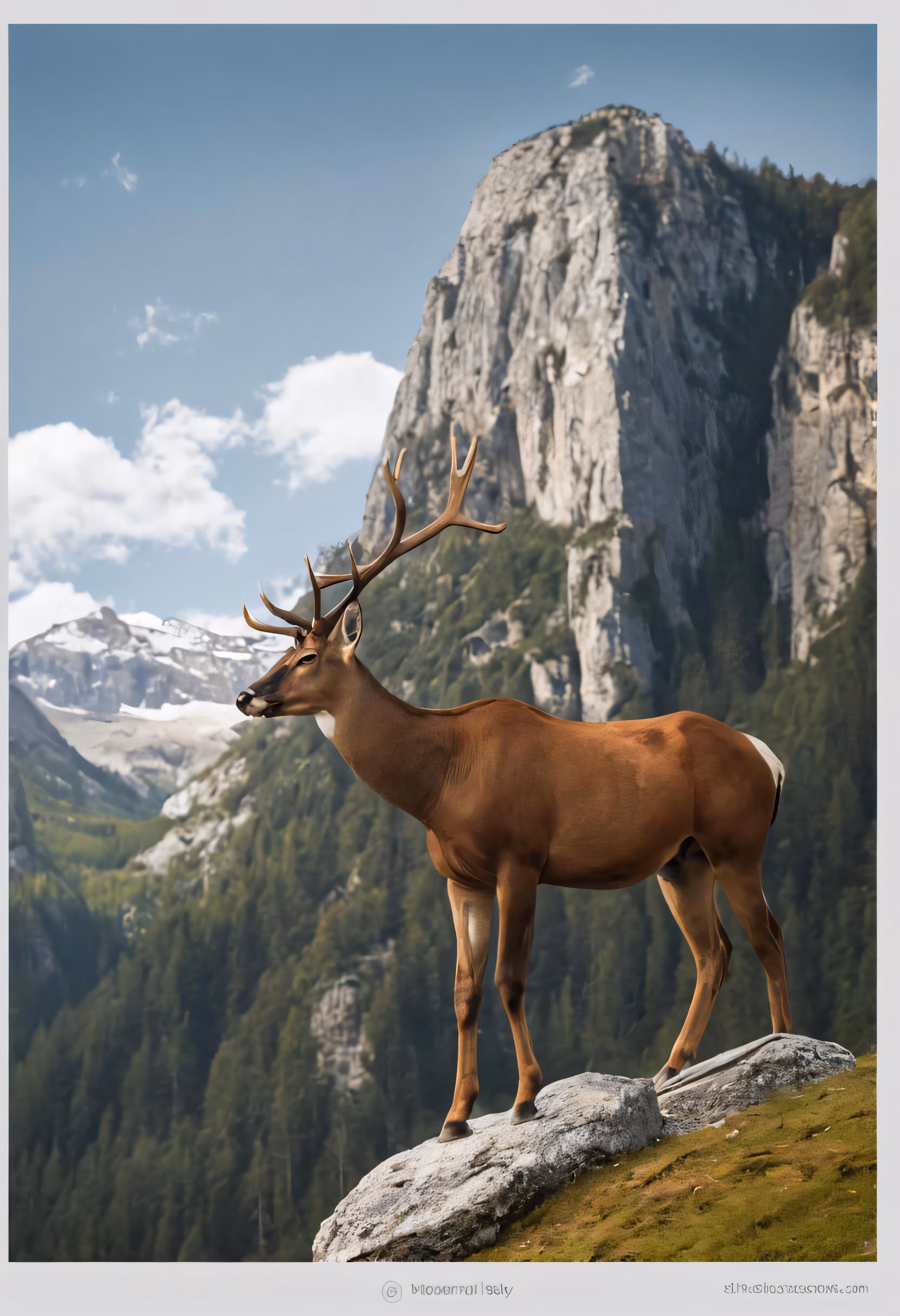 High resolution picture, free to use, a deer is standing in the foreground and a mountain on the other